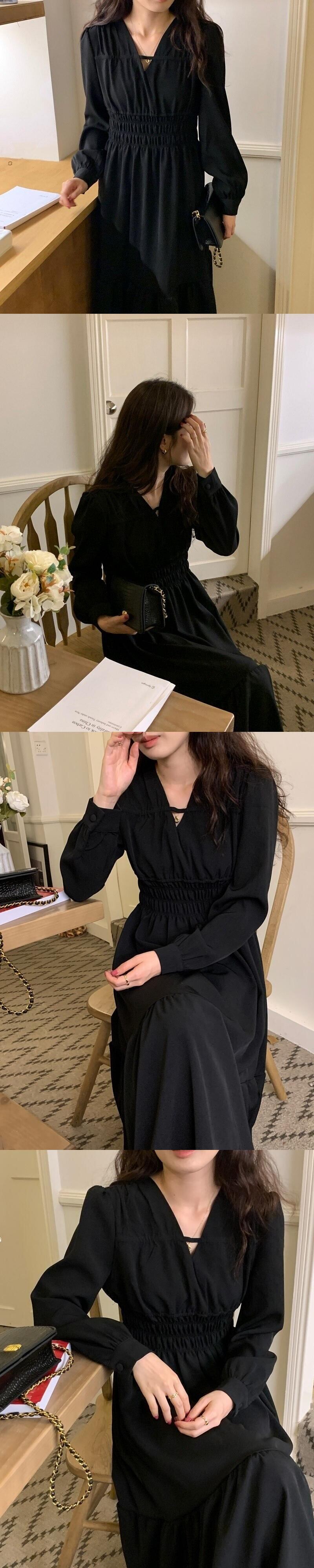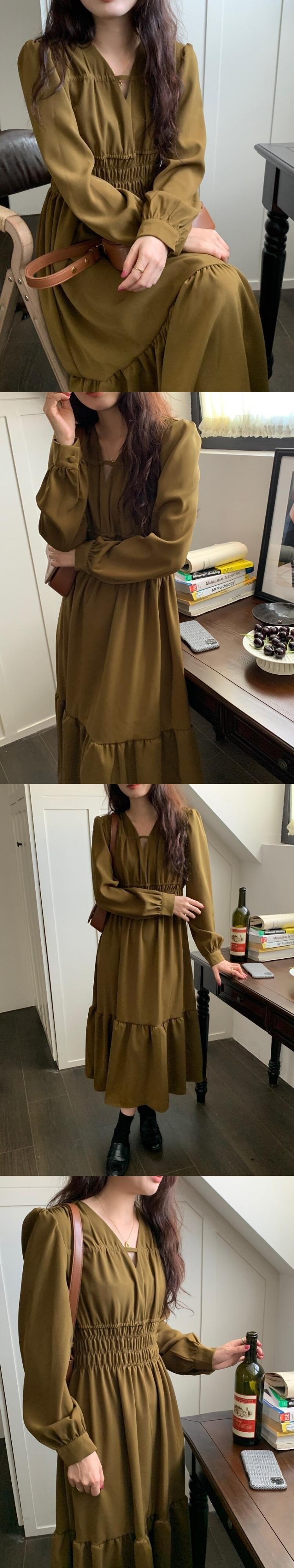 [EWQ] Vネック プリーツ フリル ドレス シック ルーズ ローブ 春 冬 長袖 レディース Vestido ロング スプリング 春物 ウィンター 冬物