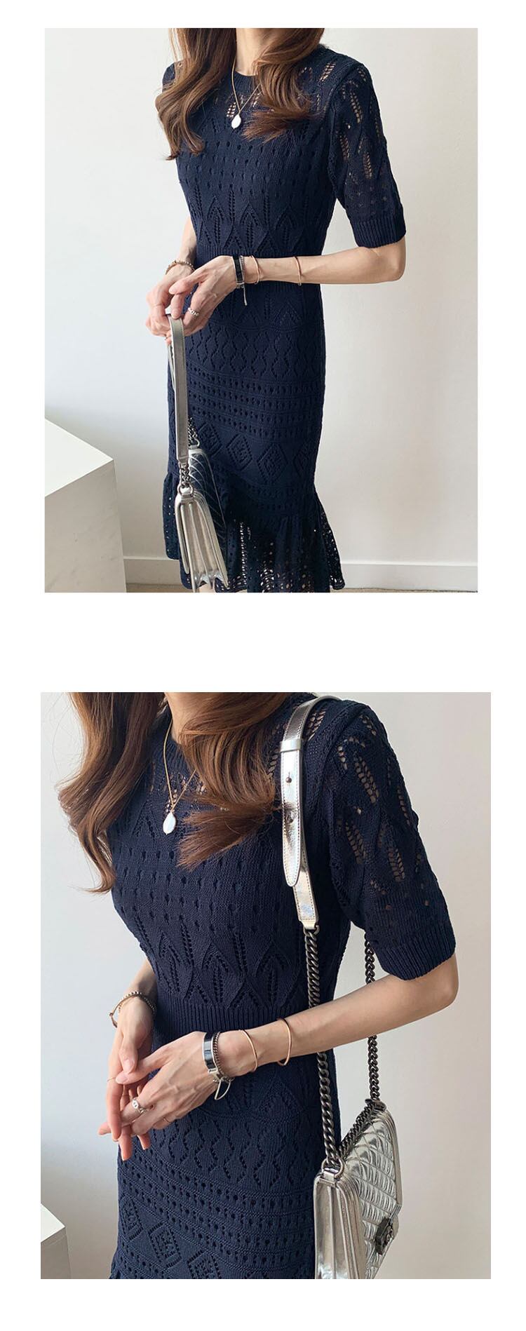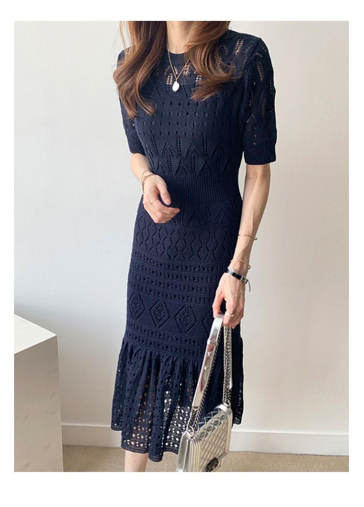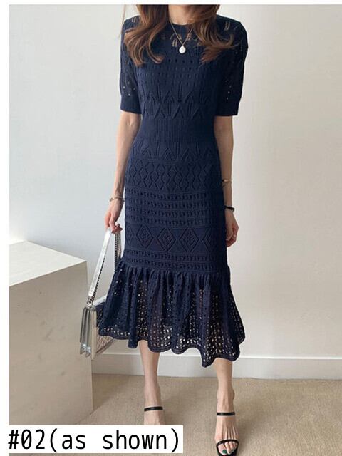 [EWQ] ニット フリル ドレス レディース O ネック スリム 半袖 中空アウト パーティードレス 夏 美しい ショート ハーフスリーブ サマー 夏物 Oネック