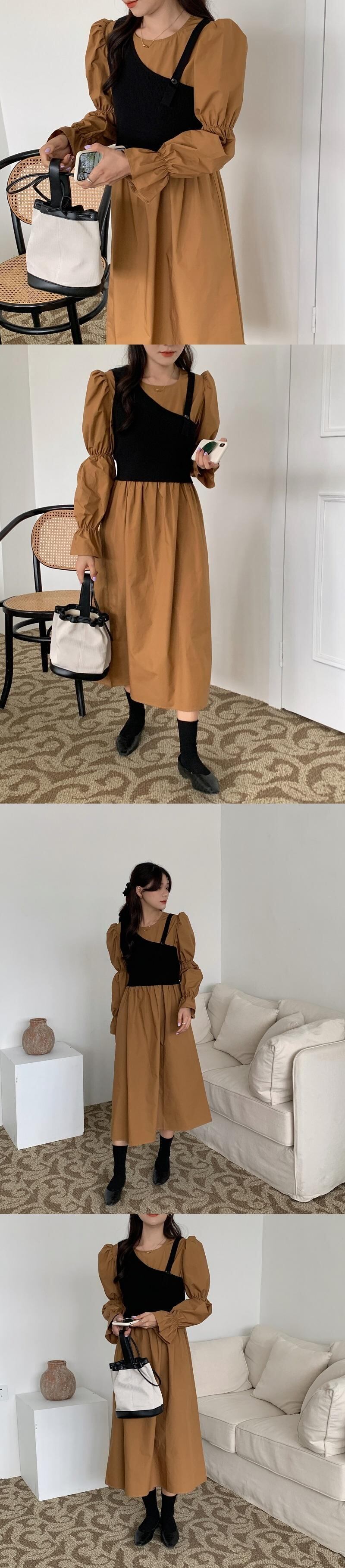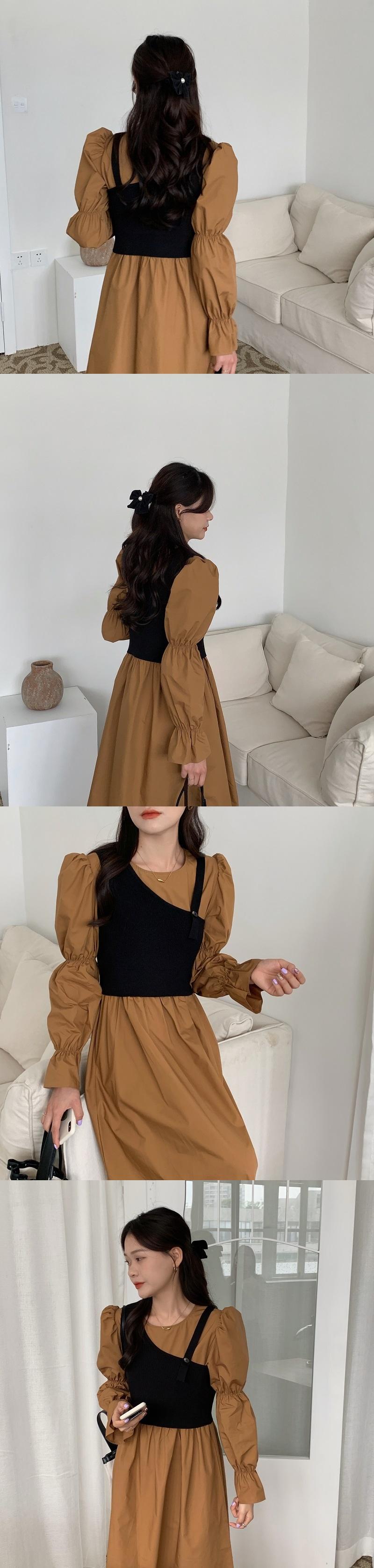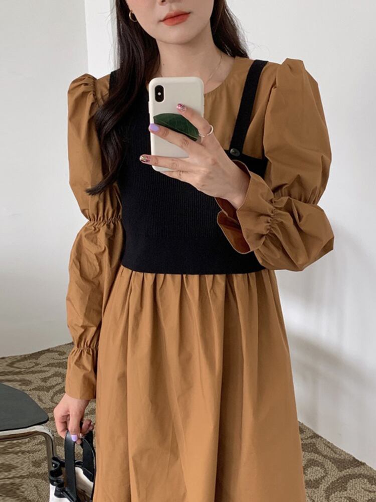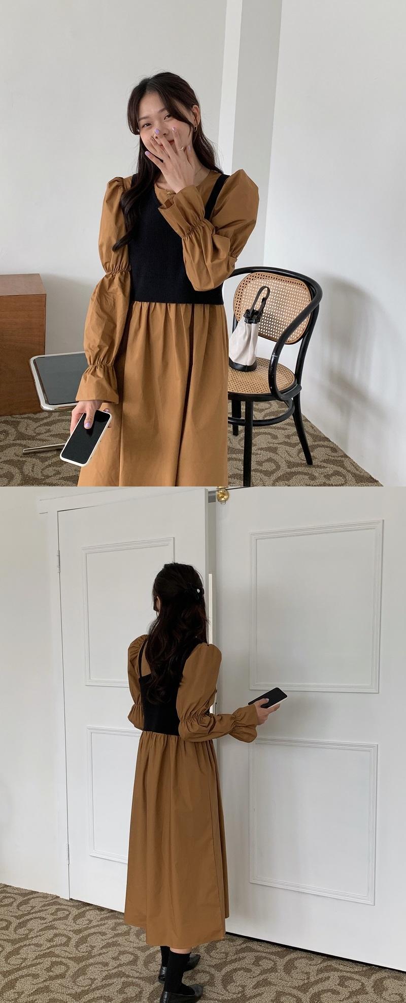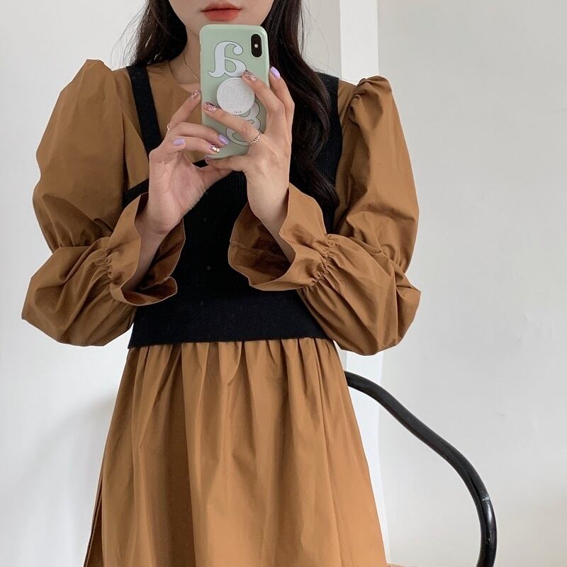 [EWQ] ニット スリング + O ネック プリーツ ウエスト ドレス パフ スリーブ ドレス春夏 Vestido 16Y7043 スプリング 春物 サマー 夏物 Oネック
