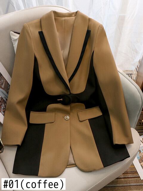 [EWQ] 黒パッチワーク長袖ブレザーコート春秋潮シングルボタンブレザージャケット 125 ロング ブラック スプリング 春物 オータム 秋物