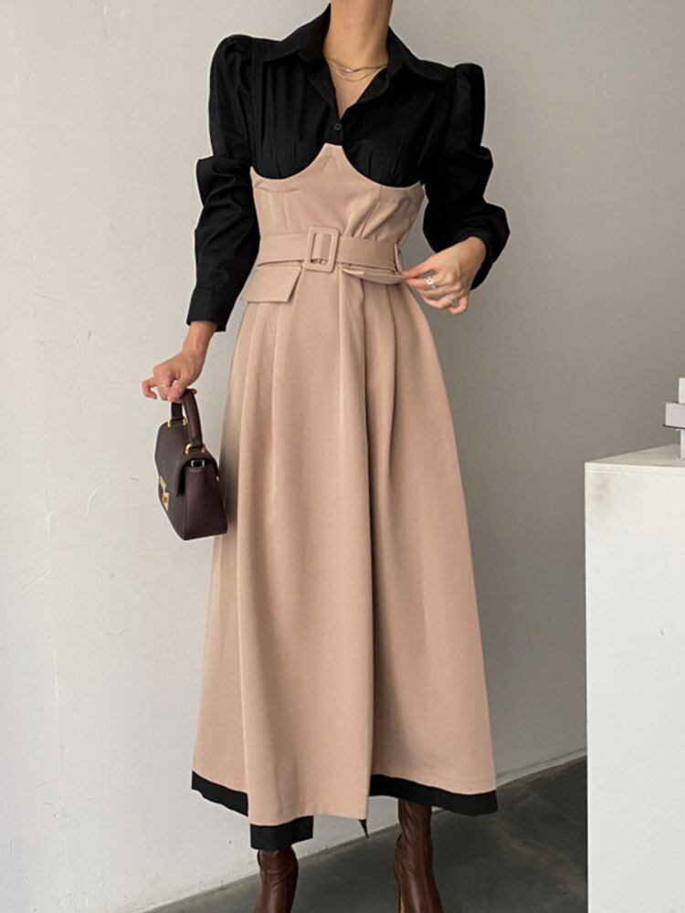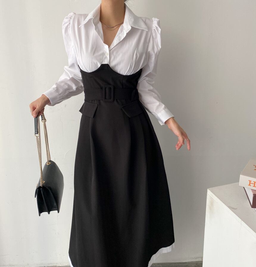 [EWQ] コントラストフェイクツーピースドレスレースアップウエストドレス春秋 A ライン Vestido 16Y6695 スプリング 春物 オータム 秋物 Aライン