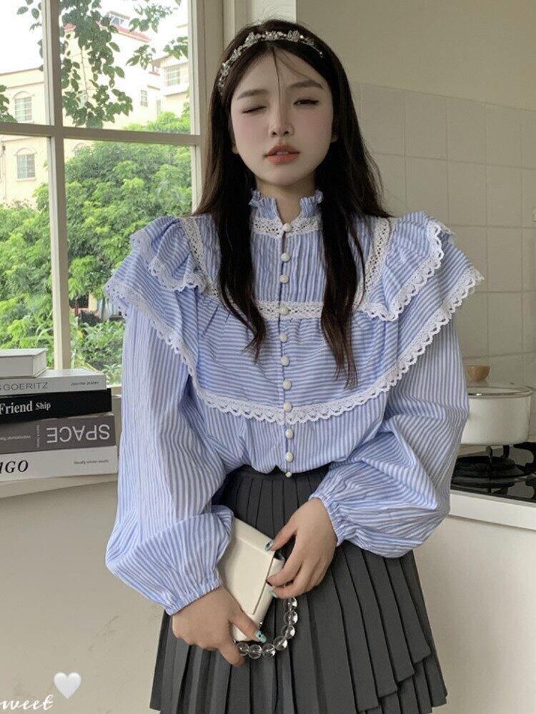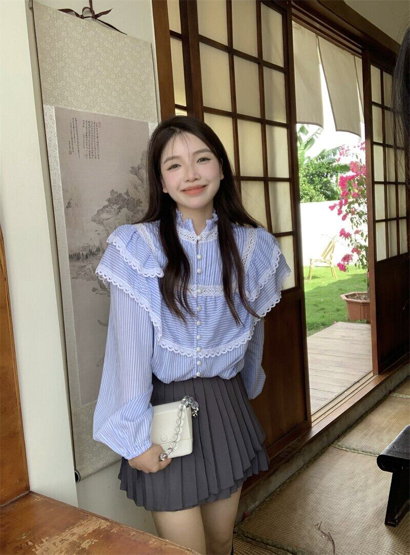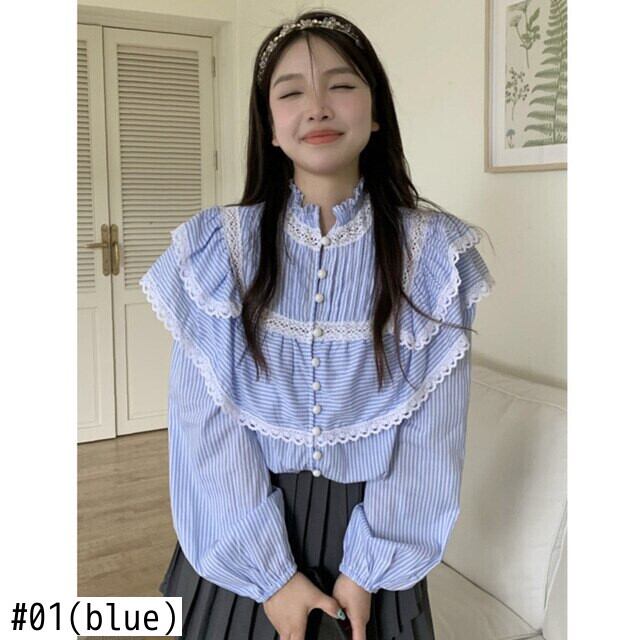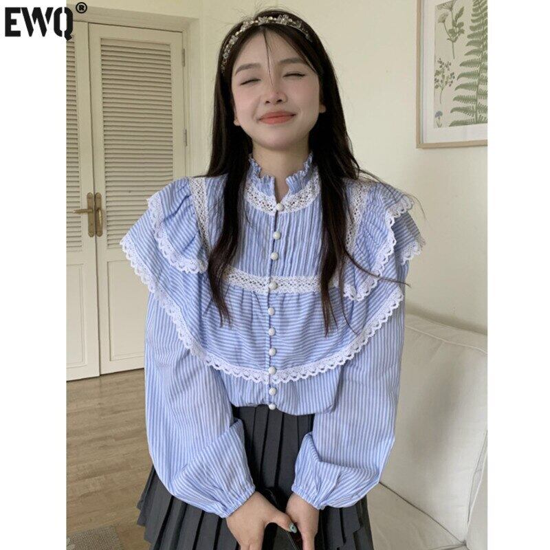 [EWQ] 甘いシャツレースパッチワークトップ春秋潮ブルーストライプブラウスシックトップス Y6388 大人ガーリー スウィート キュート カジュアル スプリング 春物 オータム 秋物