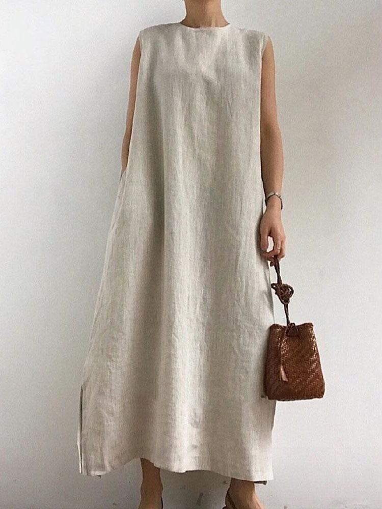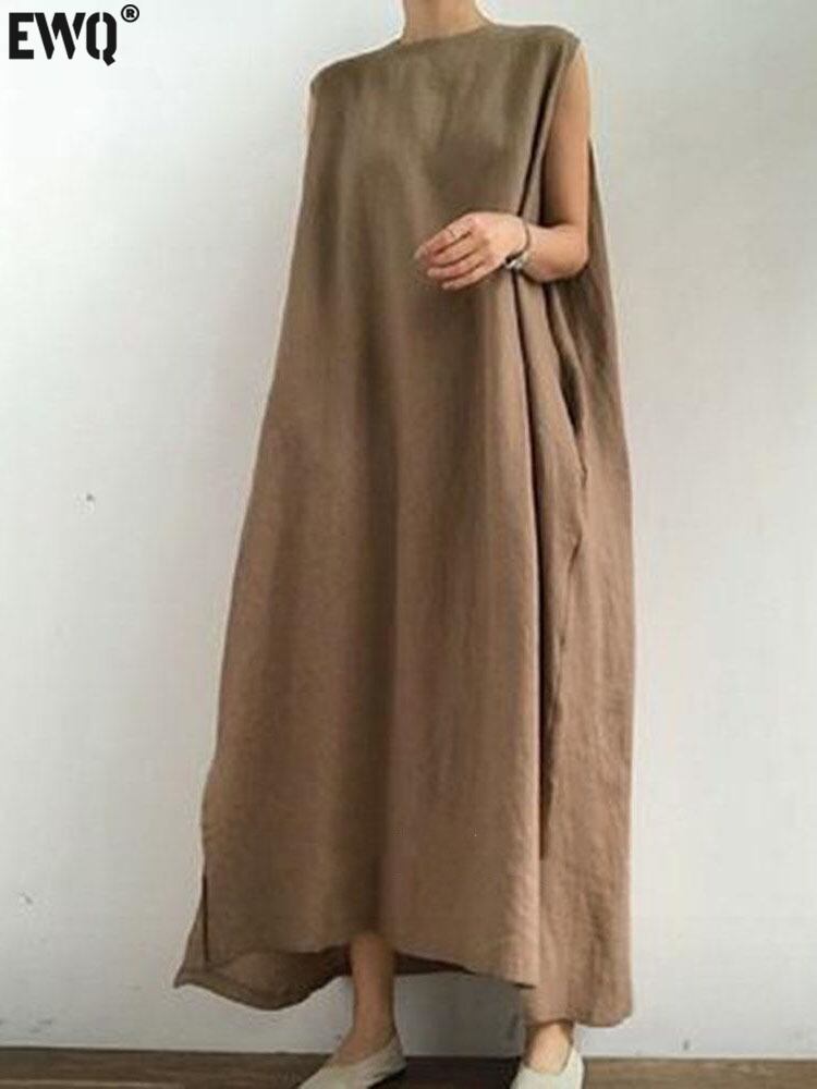 [EWQ] ミニマリズム 綿麻 ノースリーブ スプリット ベスト ドレス 無地 大きい スイング ルーズ シンプル ドレス 夏 16Y768 コットン サマー 夏物 ソリッドカラー