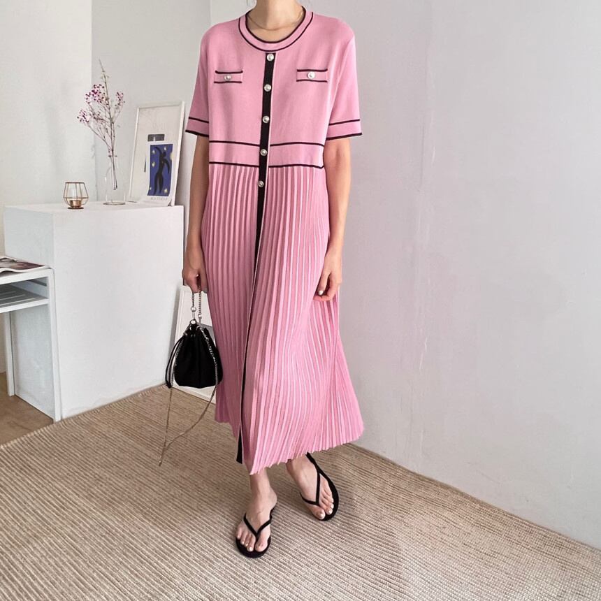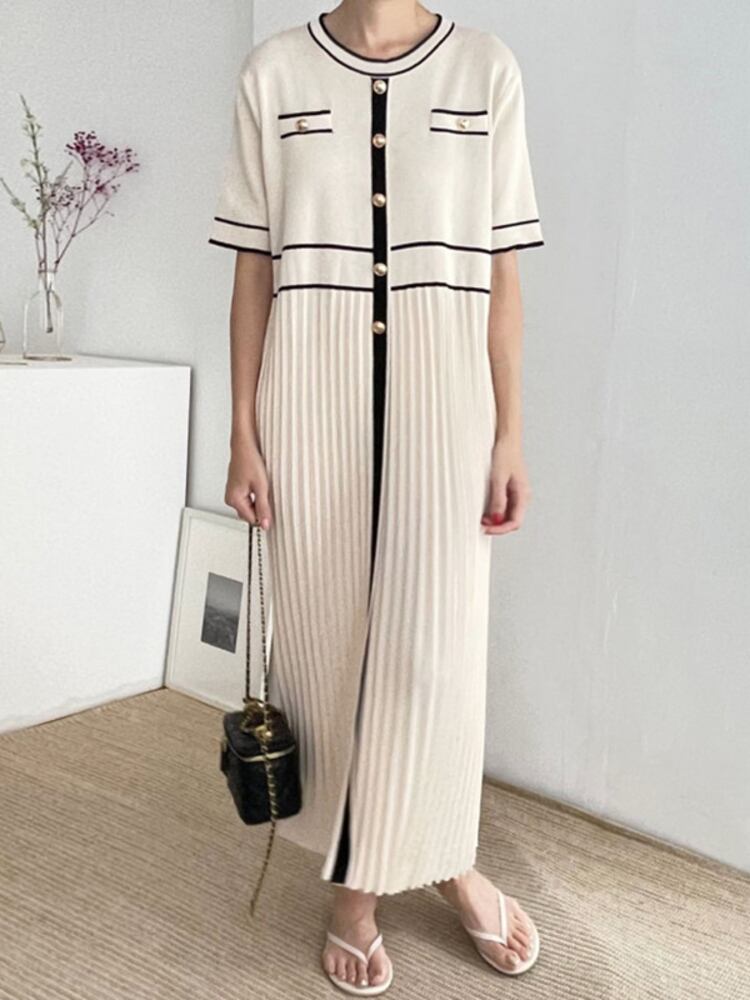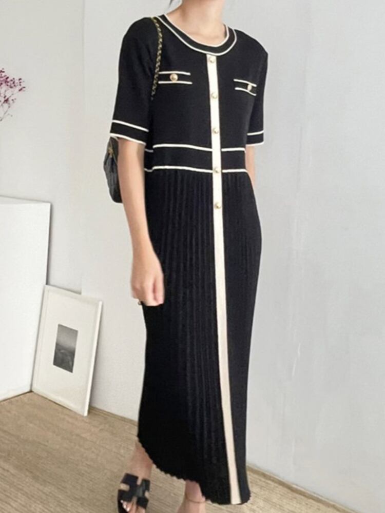 [EWQ] プリーツ スプライス シングル ブレスト レディース ドレス パッチワーク O ネック マキシ ドレス サマー タイド ロード 6Y7548 夏物 Oネック
