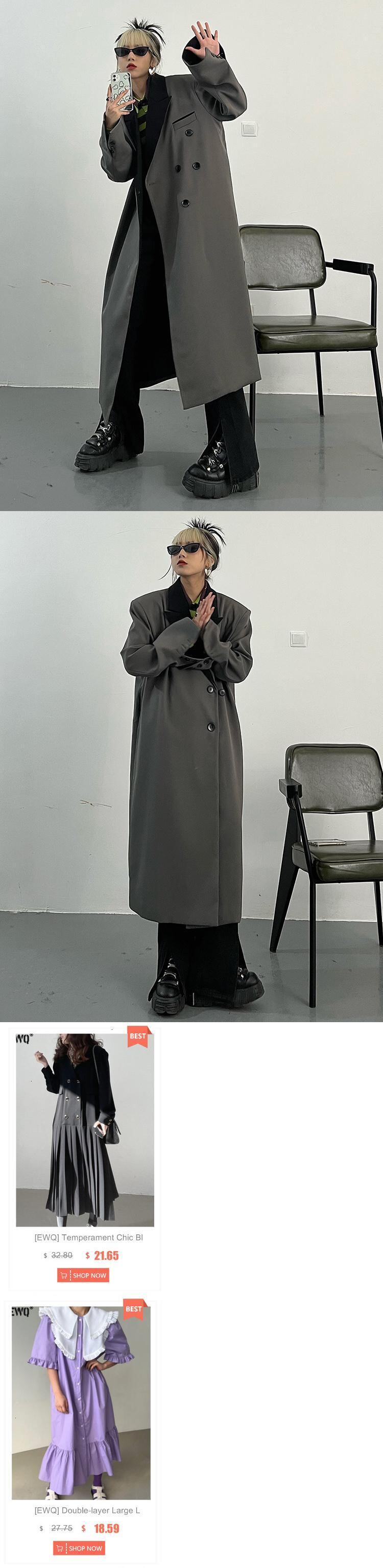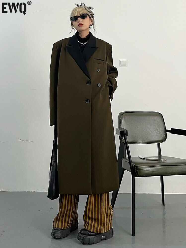 [EWQ] レディース コーヒー ショルダー パッド入り ビッグサイズ ロング ウインドブレーカー ラペル 長袖 タイド トレンチコート アウター 秋 オータム 秋物