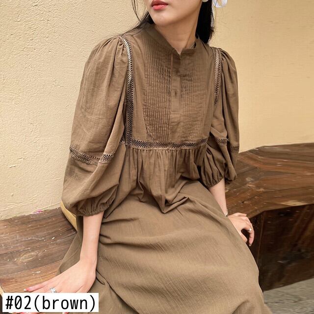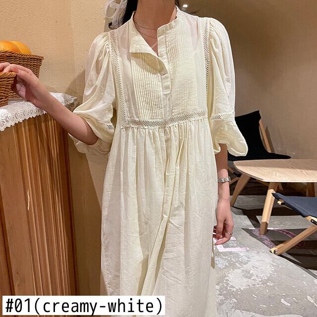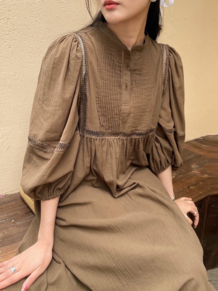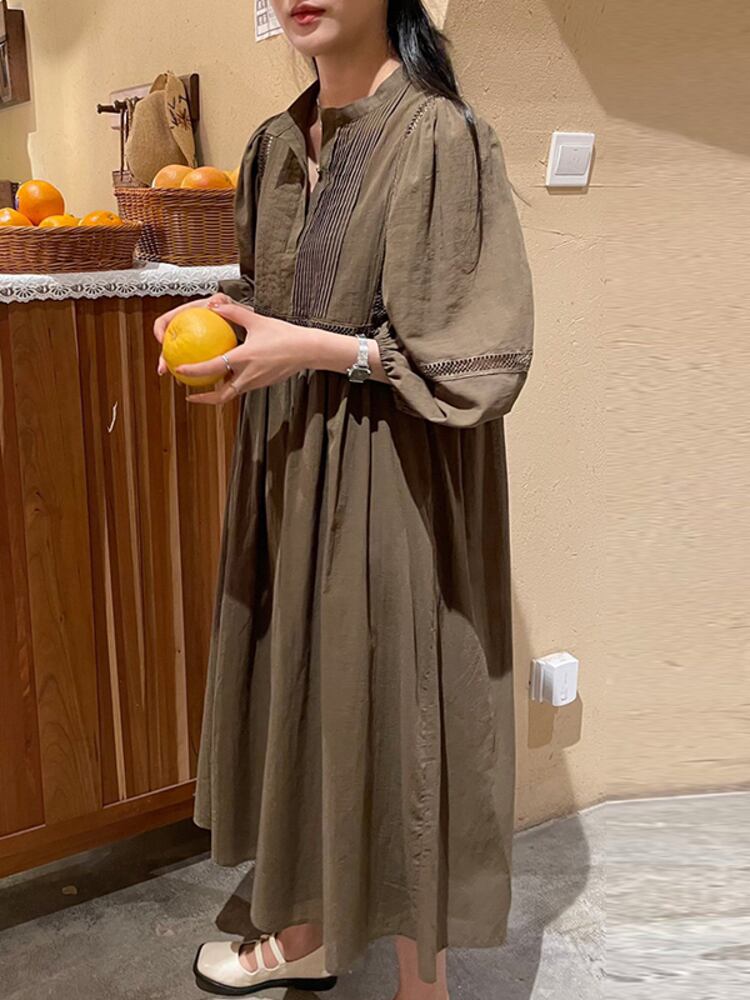 [EWQ] パフスリーブ無地パッチワークドレスルーズ因果スタンドネックマキシドレス夏 Vestido 16Y8454 サマー 夏物 ソリッドカラー
