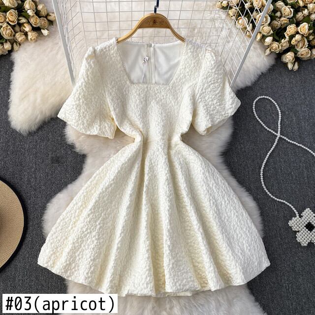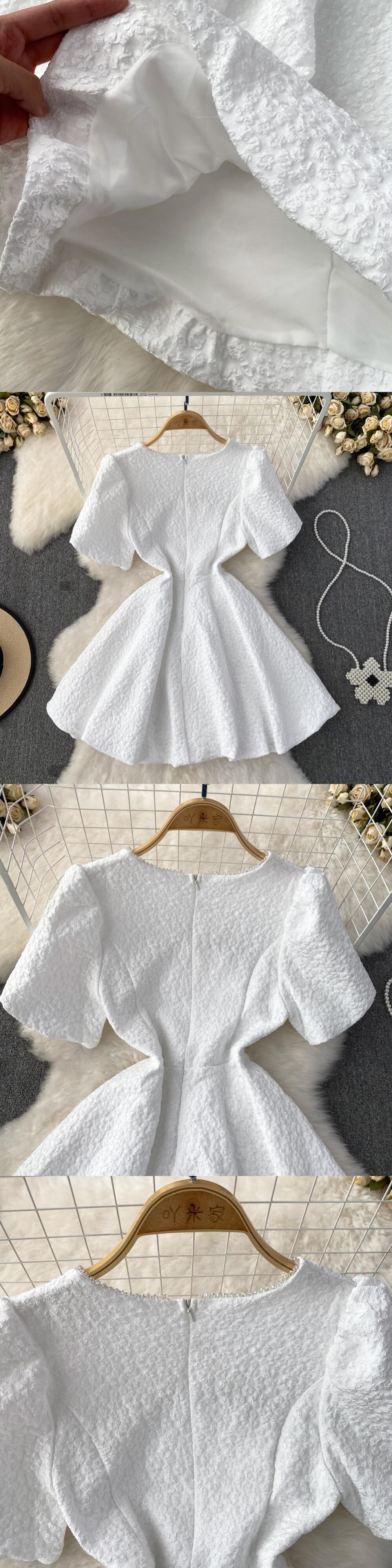 [EWQ] 甘いバブルスリーブビーズスプライスドレススクエアネックミニドレスサマーパーティー Vestido Y8144 大人ガーリー スウィート キュート カジュアル 夏物 スクウェア