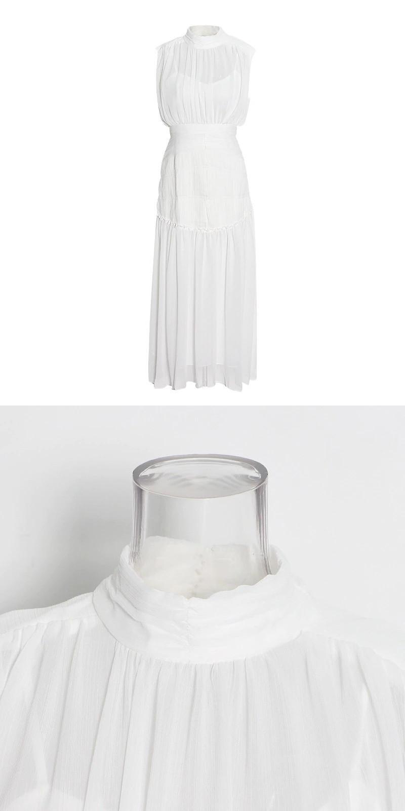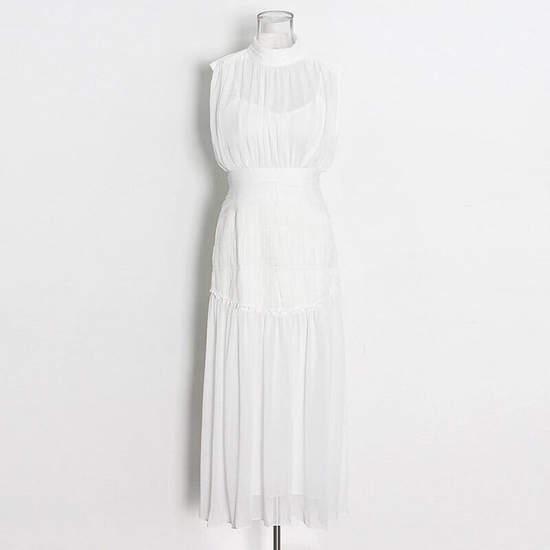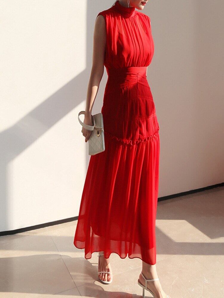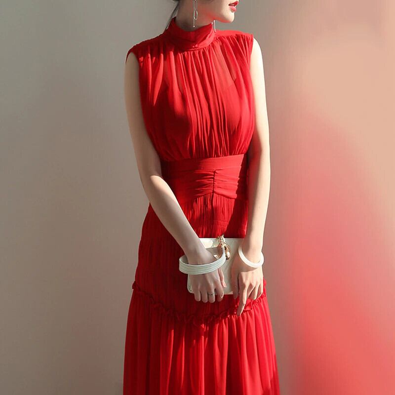 [EWQ] ウエスト シフォン レッド ミディ ドレス サマー Vestidos シャーリング ドレス レディース スタンドカラー ノースリーブ 夏物