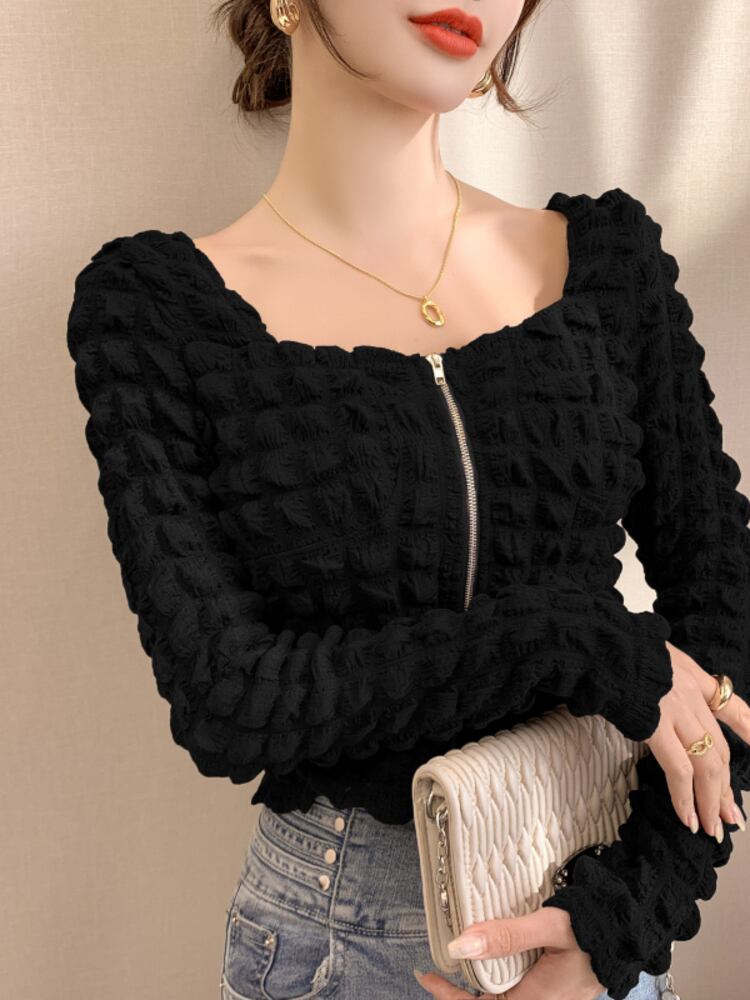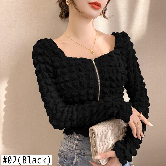 【EWQ】 レディース スクエアカラー プリーツシャツ 春 秋 シック ジッパー スプライシング ブラウス キレイめ トップス 16Y6 スプリング 春物 オータム 秋物 スクウェア