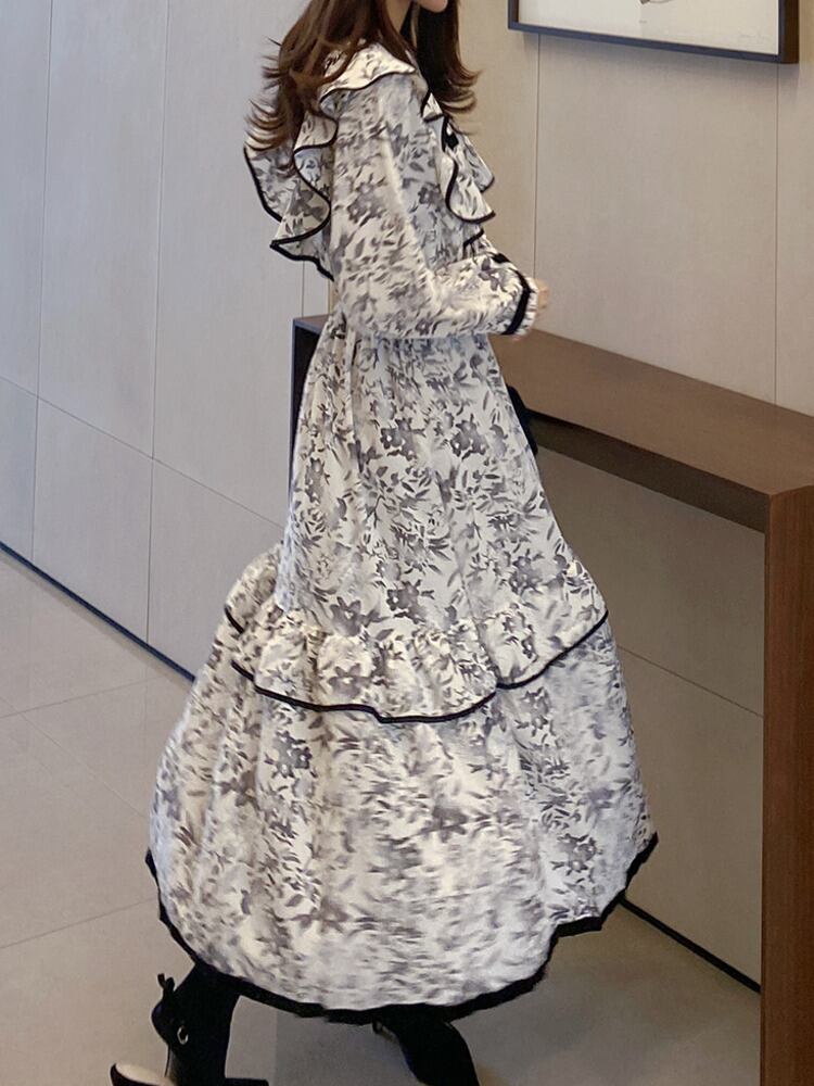 [EWQ] フリル スプライシング カラー プリント ドレスコントラスト弾性ウエスト マキシ ドレス春秋 Vestido 71 エラスティック 伸縮 スプリング 春物 オータム 秋物
