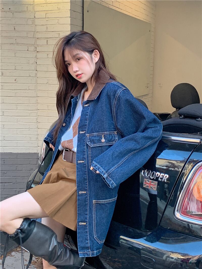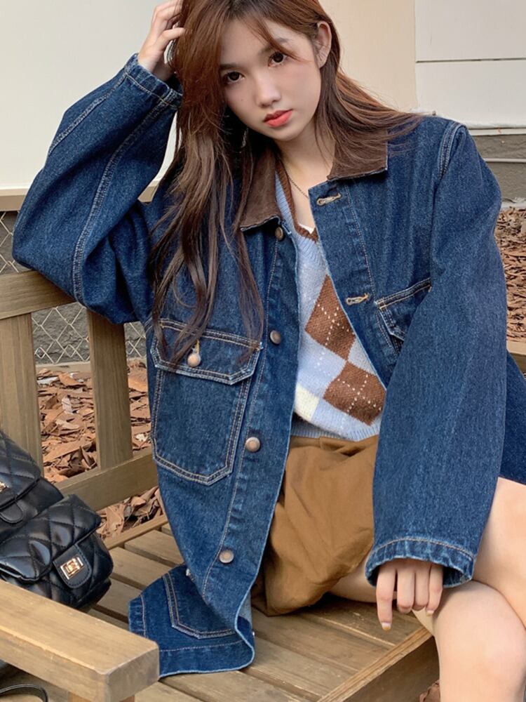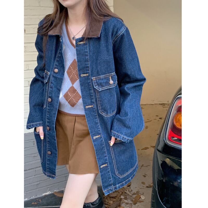 【EWQ】パッチワーク ターンダウンカラー デニムジャケット レディース ポケット付き 長袖 ジャケット コート 春秋 16Y6553 ロング スプリング 春物 オータム 秋物