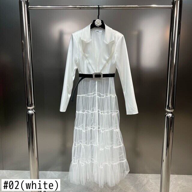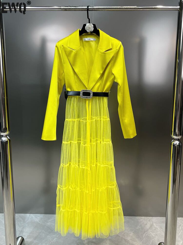 [EWQ] メッシュスプライシングレースアップドレス長袖ガーゼ無地パッチワークドレス春夏 Vestido 034 ロング スプリング 春物 サマー 夏物 ソリッドカラー
