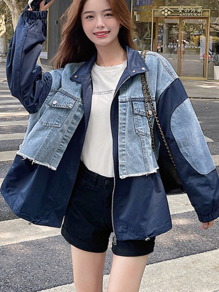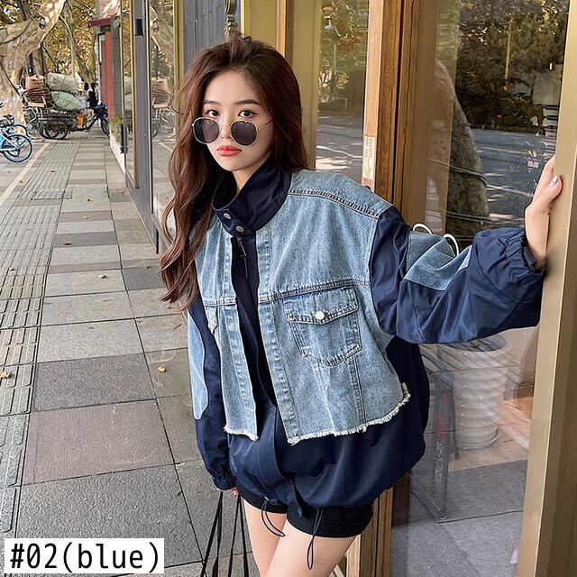 [EWQ] デニム パッチワーク ジャケット長袖巾着ジャケット コート春秋コントラスト コート 16Y6660 ロング スプリング 春物 オータム 秋物