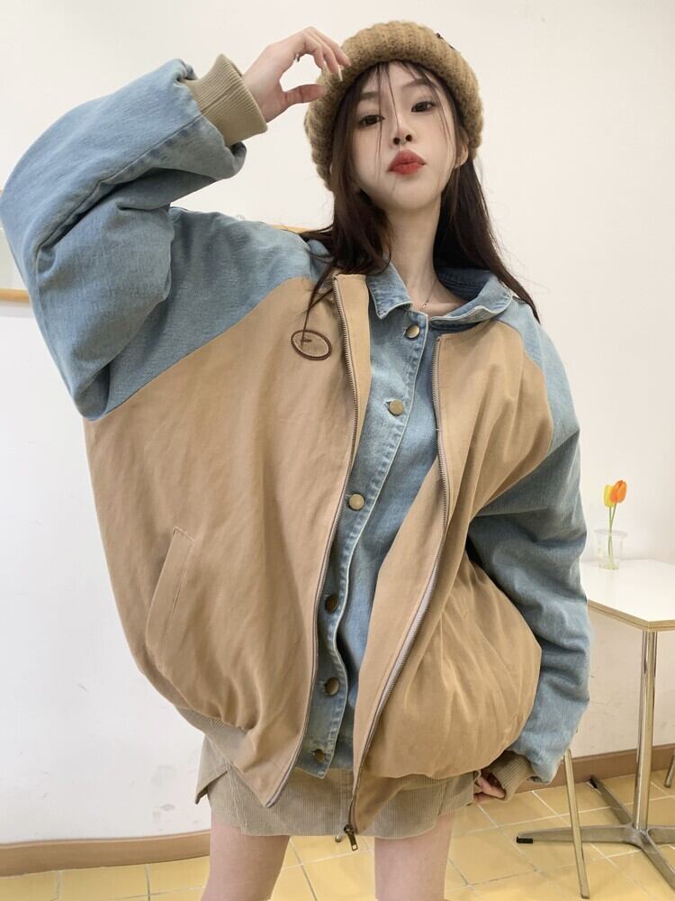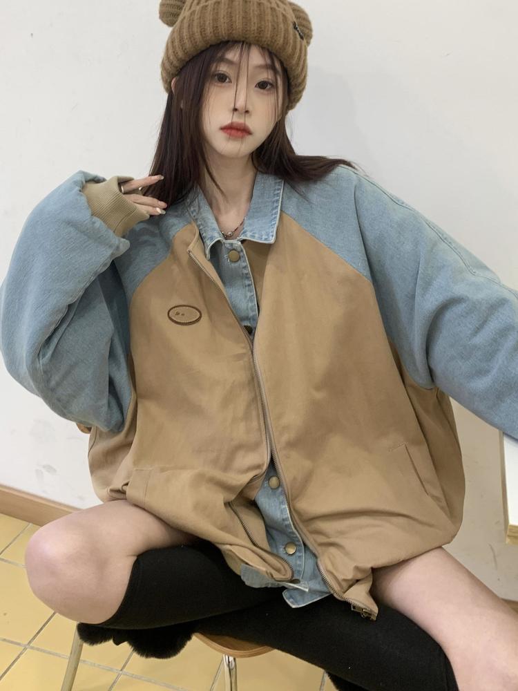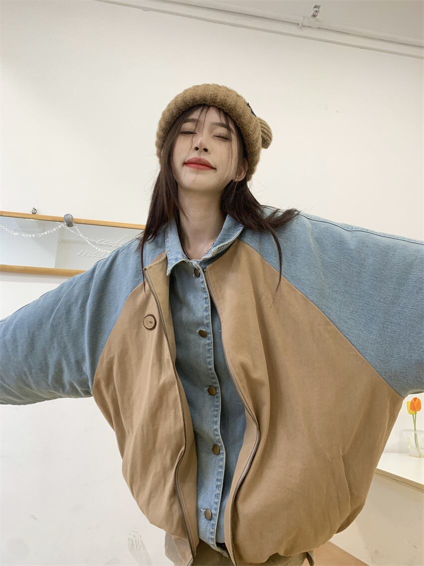 [EWQ] フェイクツーピースデニムパッチワークジャケット長袖ジャケットコート春秋レジャー Outwears 16Y6584 ロング スプリング 春物 オータム 秋物