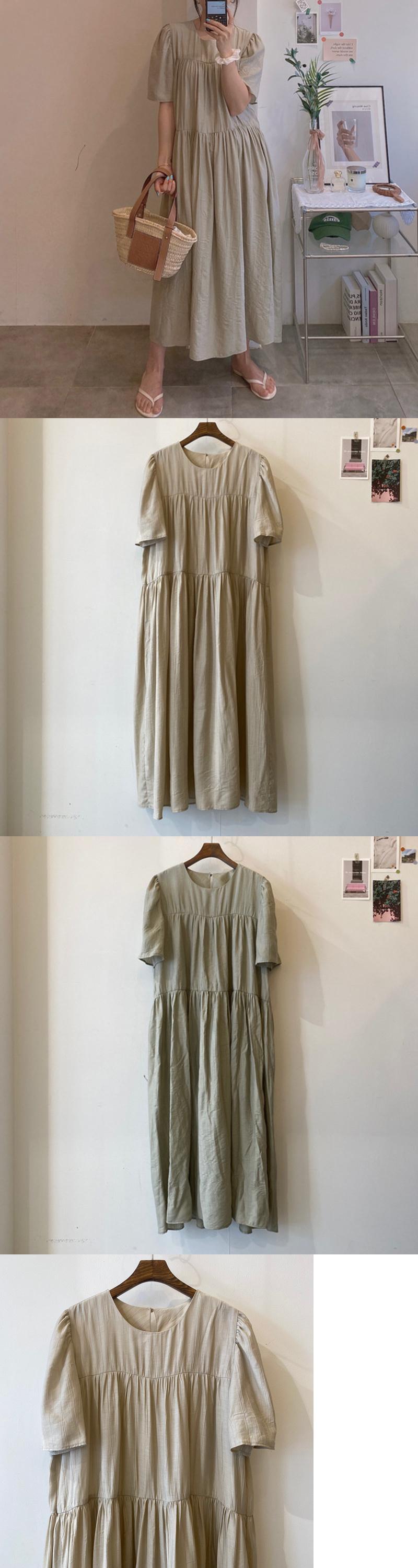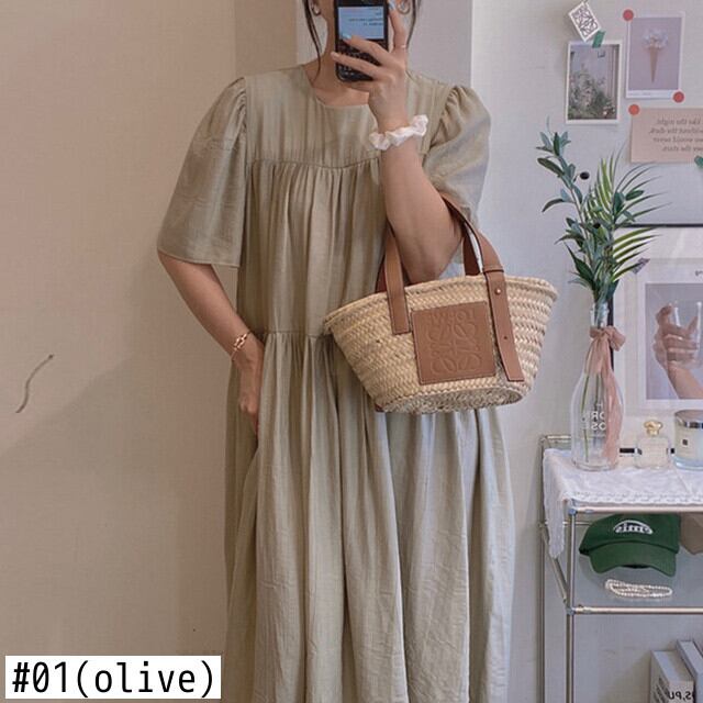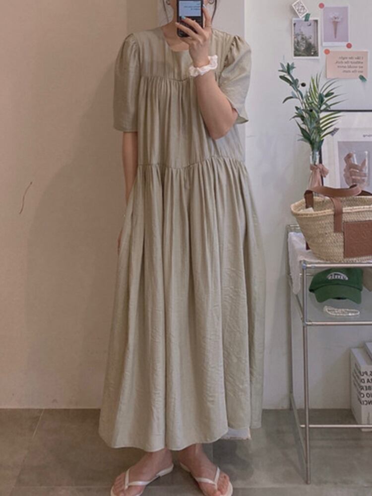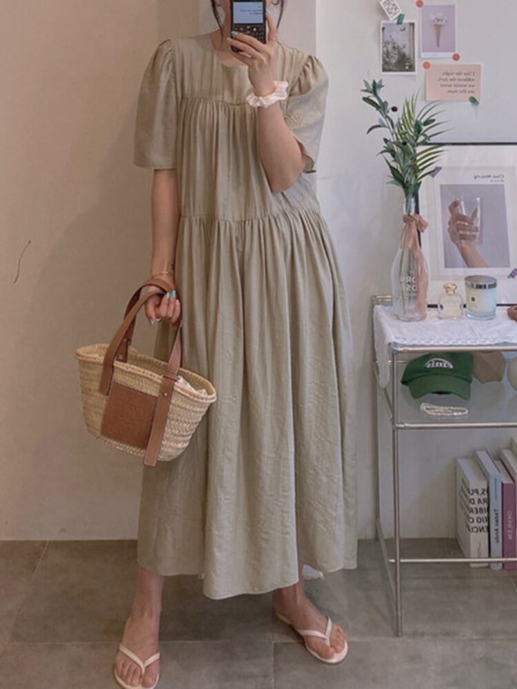 [EWQ] シンプル O ネック ルーズ ドレス無地パフ スリーブ マキシ ドレス夏トレンド Vestido 16Y7879 サマー 夏物 Oネック ソリッドカラー