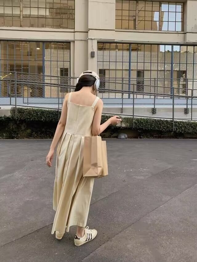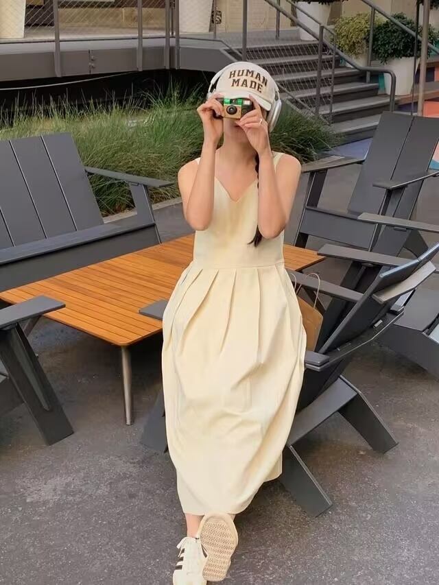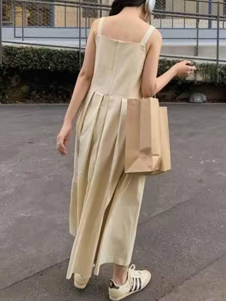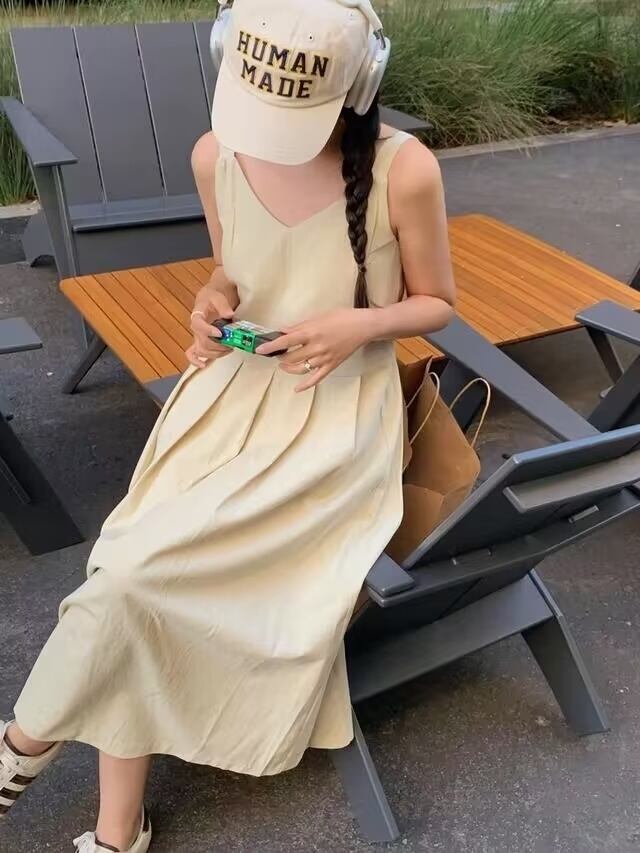 [EWQ] プリーツ ノースリーブ Vネック ドレス レディース 無地 ベスト ドレス 春夏 ルーズ Vestido 022 スプリング 春物 サマー 夏物 ソリッドカラー