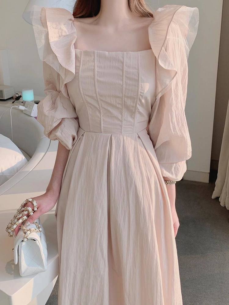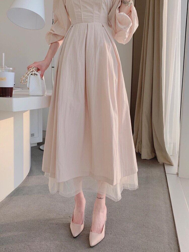 [EWQ] スクエア ネックプリーツ メッシュ スプライシング ドレス春秋シック無地 Vestido パーティー Rode 16Y6 スプリング 春物 オータム 秋物 ソリッドカラー スクウェア