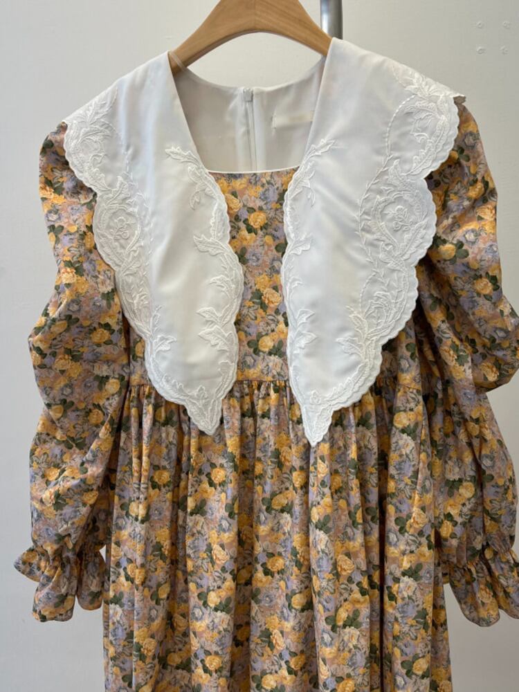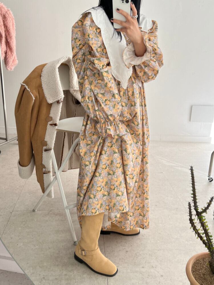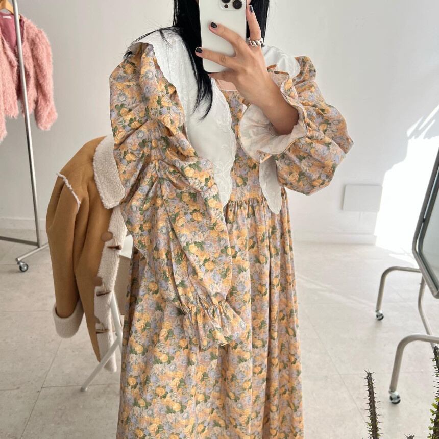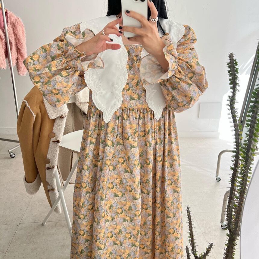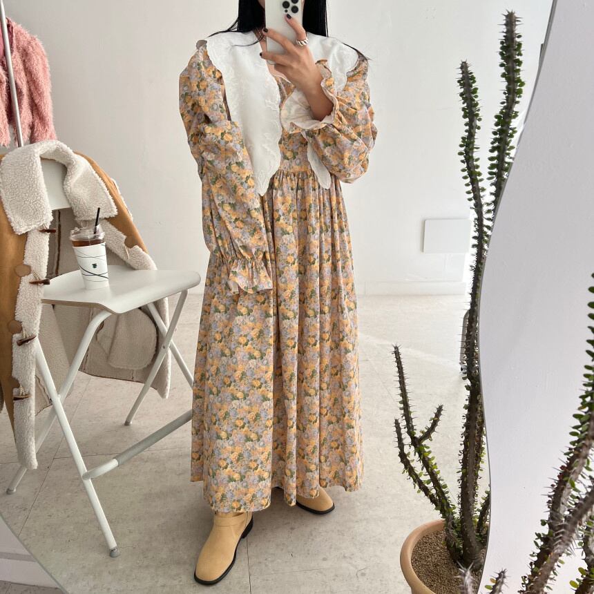 [EWQ] レース パッチワーク プリント A ライン ドレス長袖コントラスト マキシ ドレス春秋 Vestido Y6633 ロング スプリング 春物 オータム 秋物 Aライン