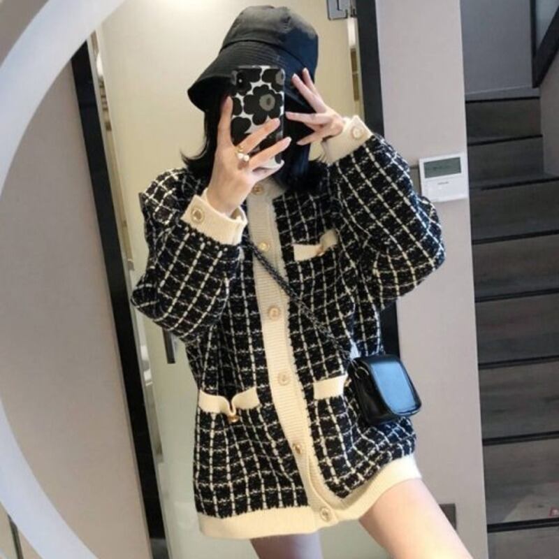 【EWQ】オータムセーターコート レトロシャツ チェック 長袖 シングルブレスト チェック柄 ルーズニット カーディガン 潮 QB321 ロング 秋物