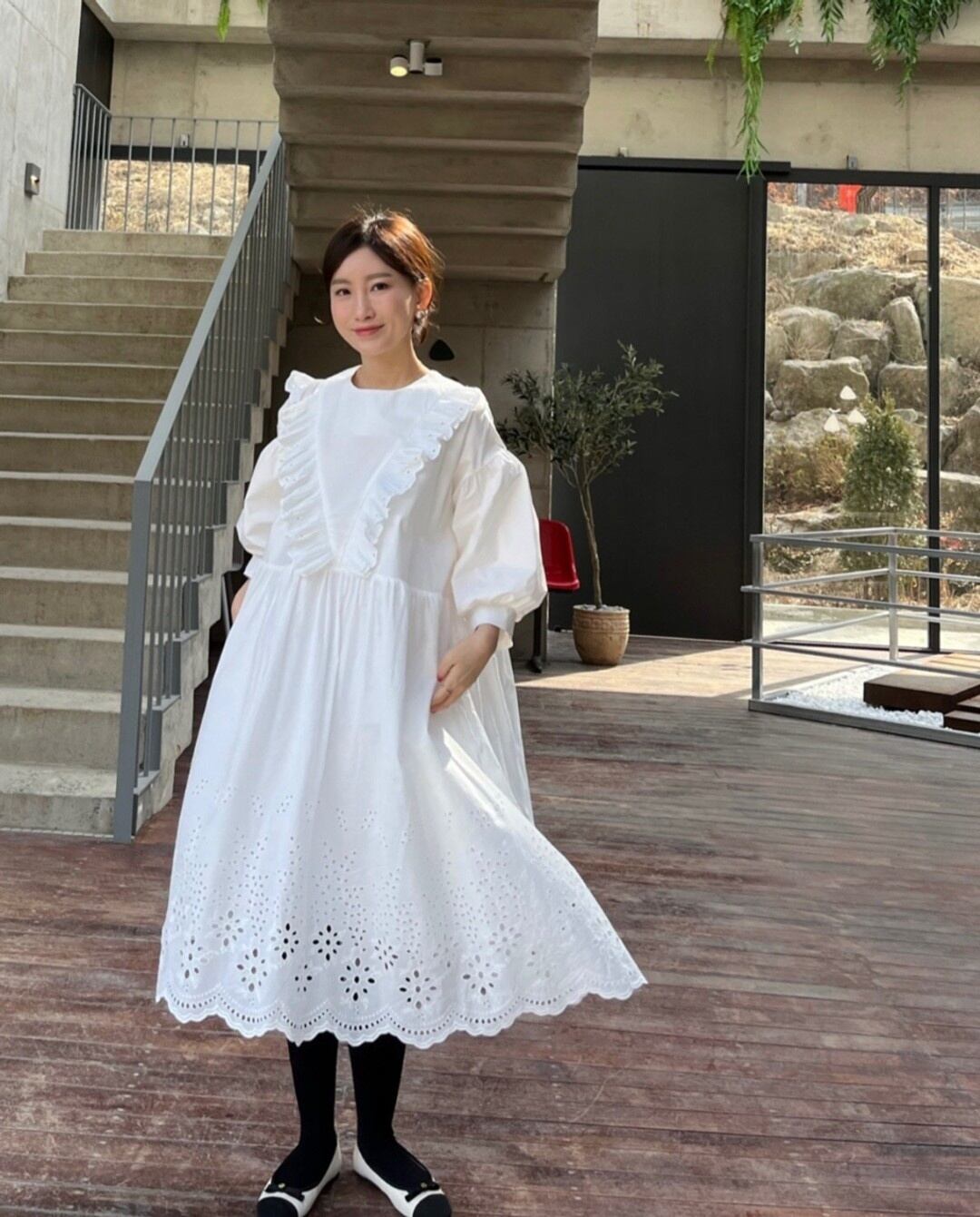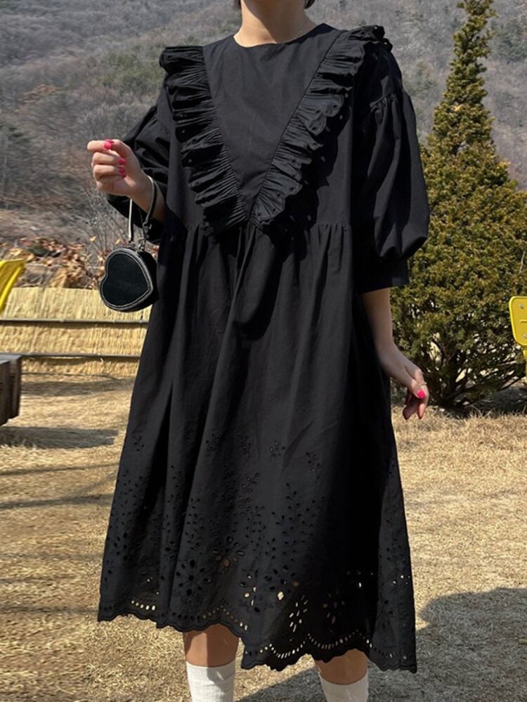 [EWQ] ルーズフックフラワーパフスリーブドレスフリルスプライスプリーツウエスト O ネックドレス 203 夏 Vestido 7632 サマー 夏物 Oネック フラワーデザイン