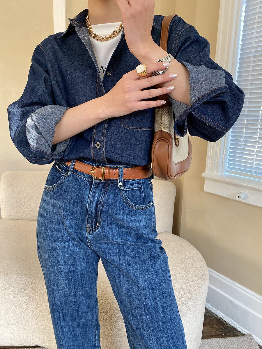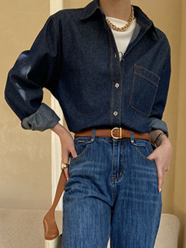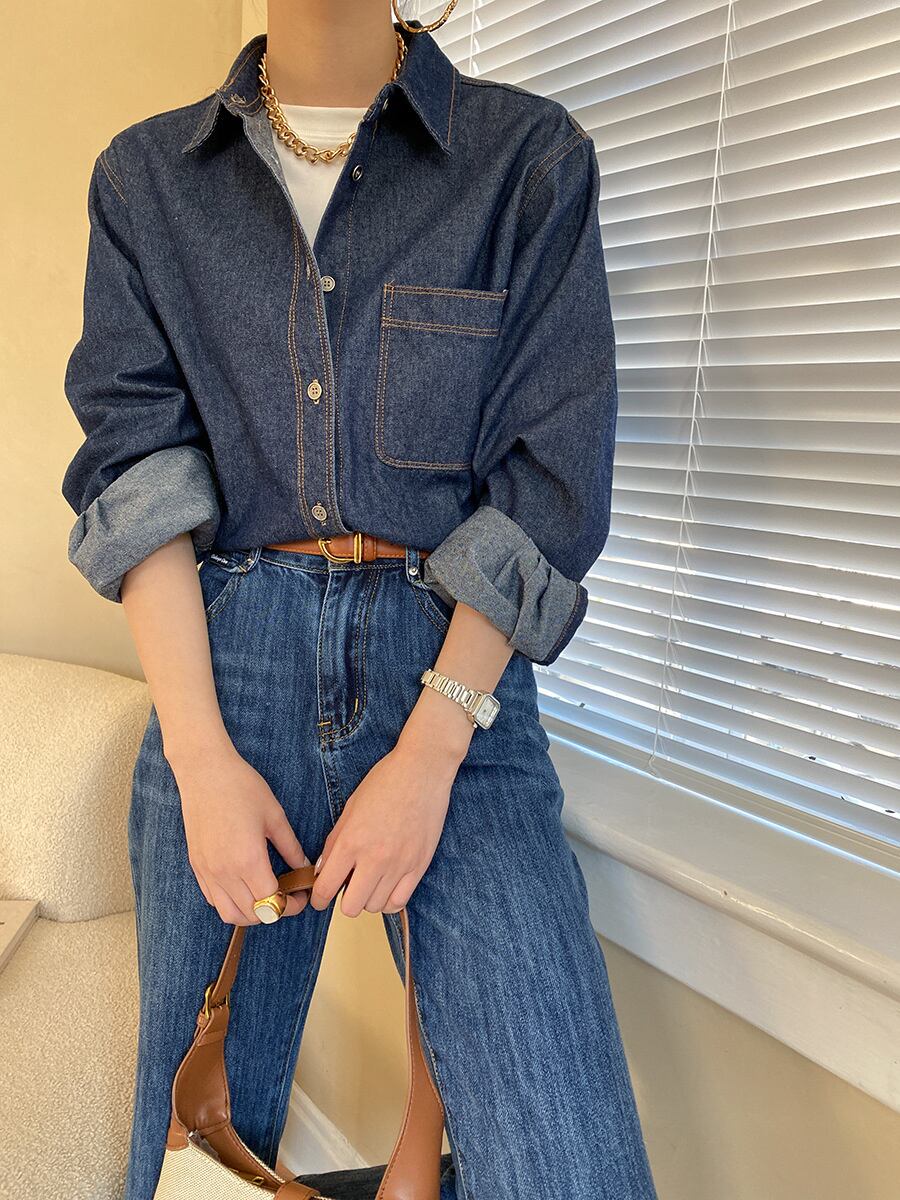[EWQ] 長袖カラーコントラストブライトラインデニムシャツシングルブレストブラウス春秋シックシャツ 16Y590 ロング スプリング 春物 オータム 秋物