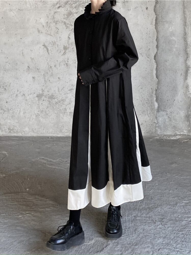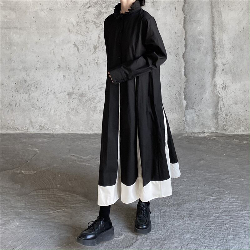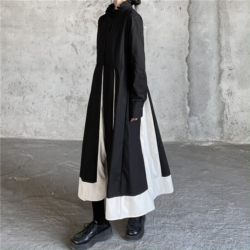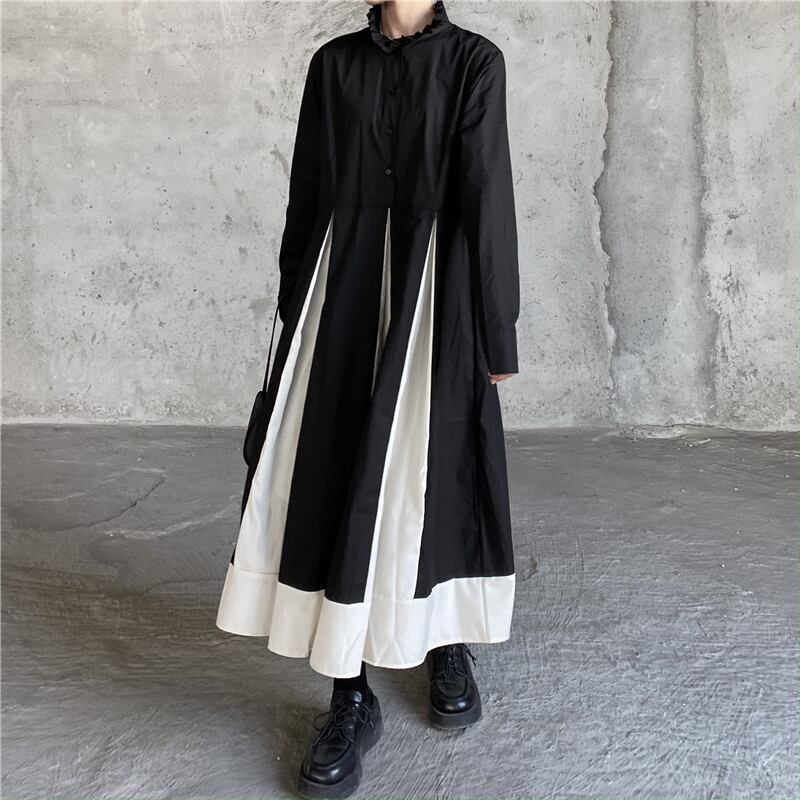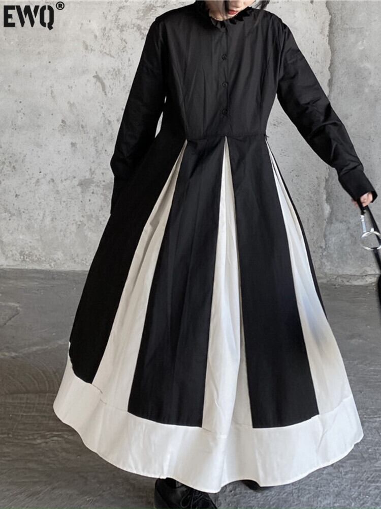 [EWQ] ブラックホワイトパッチワークドレススタンドカラーストリート Vestido ドレス春秋因果 Y2K Rode 16Y6415 スプリング 春物 オータム 秋物