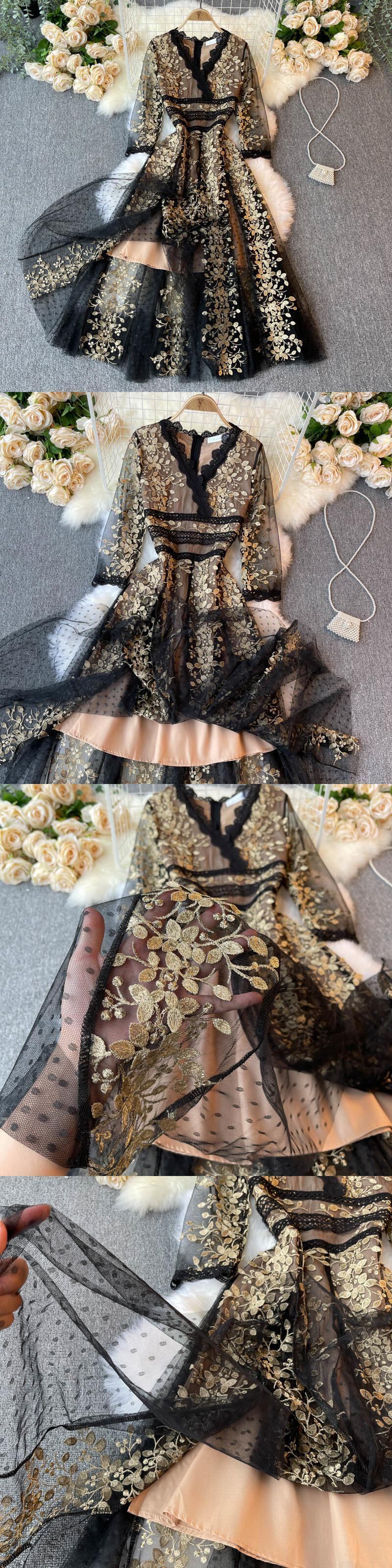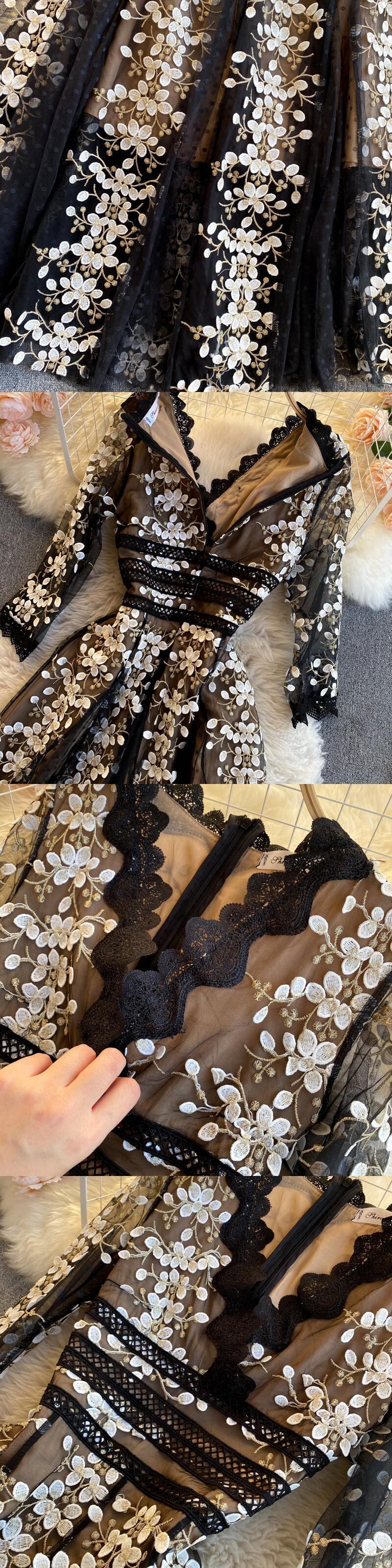 【EWQ】刺繍フラワーワンピース レディース Vネック 五分袖 ドット メッシュ パッチワーク レース ロング Vestidos レッド 半袖 ハーフスリーブ フラワーデザイン