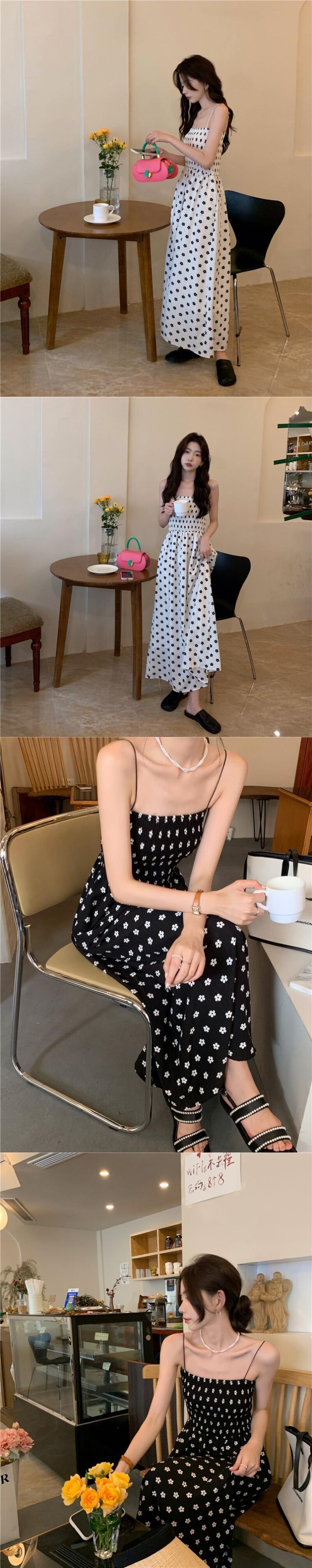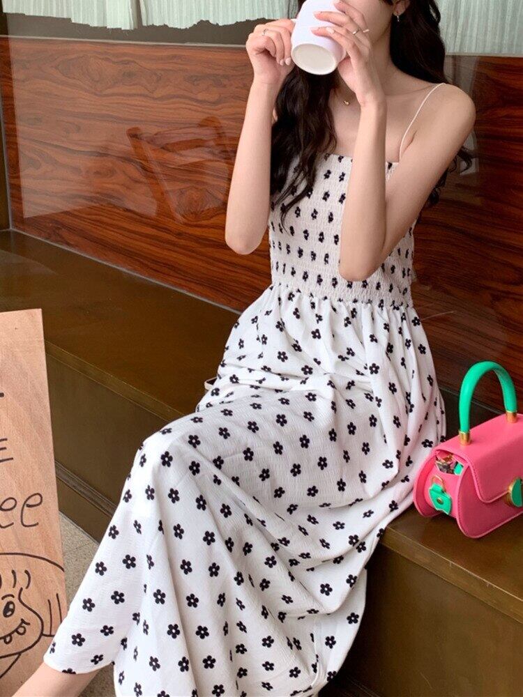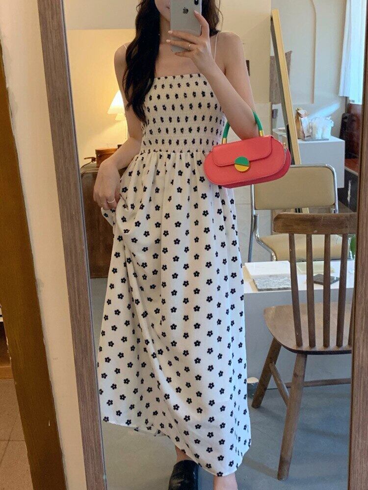 [EWQ] フラワー プリント スリング ドレスノースリーブ コントラスト A ライン ドレス春夏バックレス Vestido Y6666 スプリング 春物 サマー 夏物 Aライン フラワーデザイン