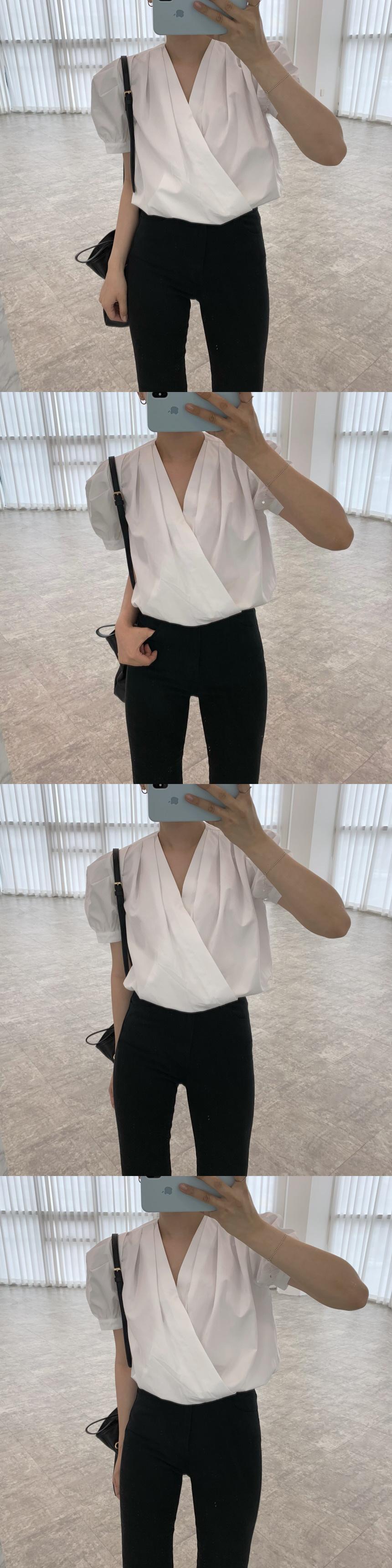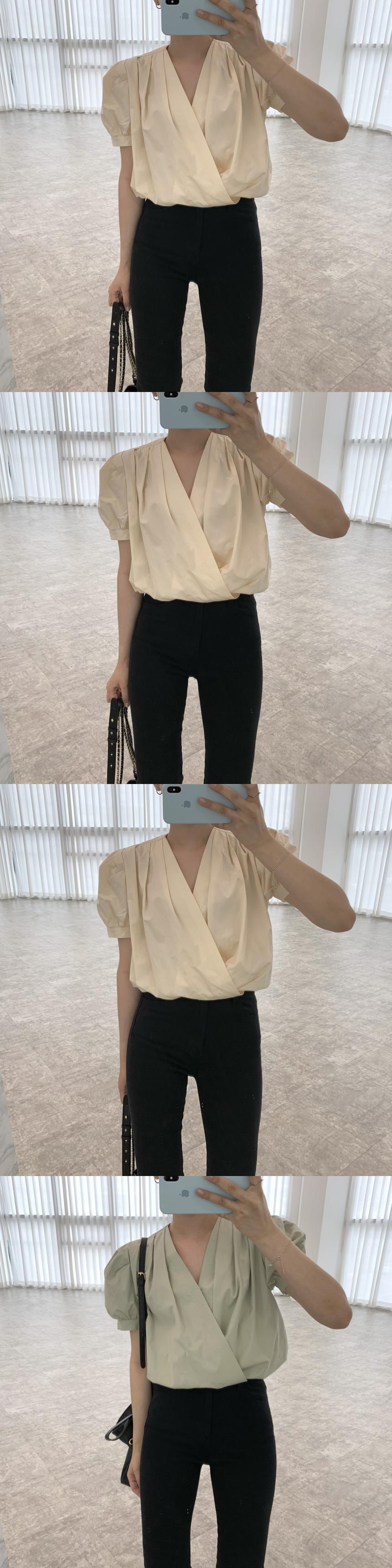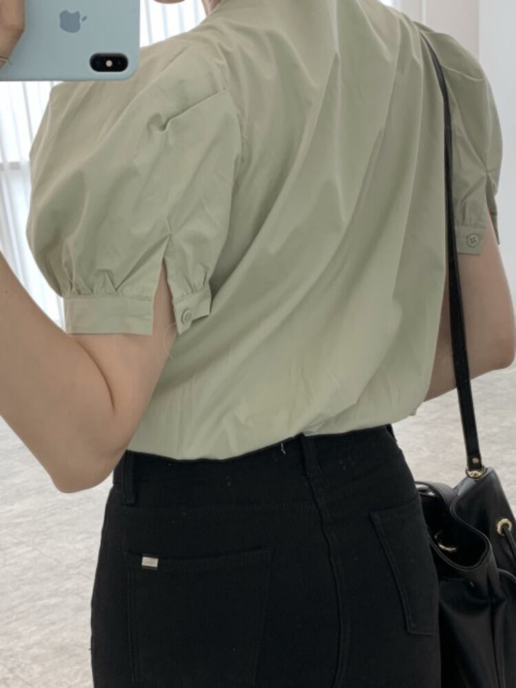 [EWQ] レディース クロス Vネック プリーツ シャツ ルーズ 無地 バブルスリーブ ブラウス サマートップ 16Y8182 夏物 ソリッドカラー