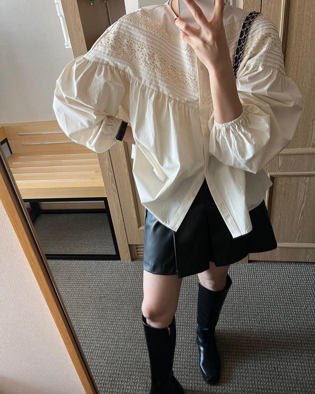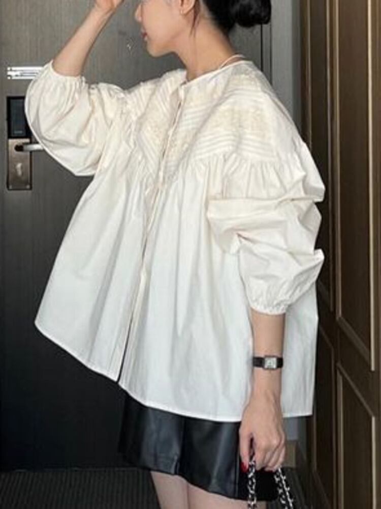 [EWQ] 中空レース フック花ルーズ シャツ O ネック プリーツ スプライス トップ春夏トップス スプリング 春物 サマー 夏物 Oネック フラワーデザイン