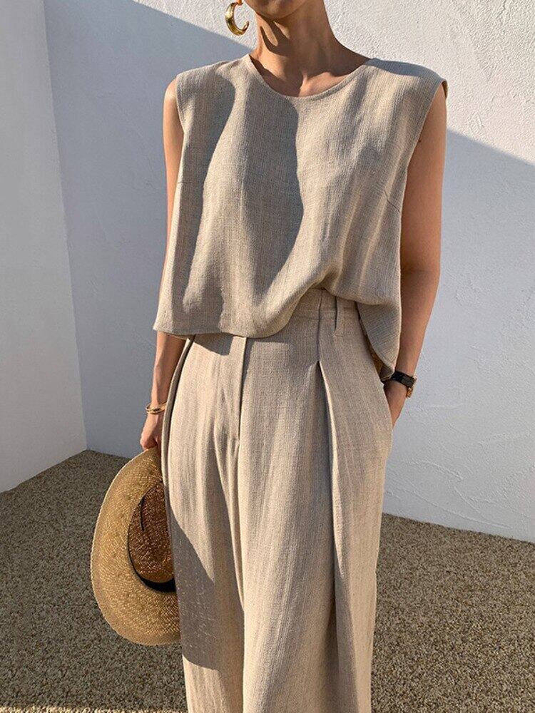 [EWQ] カーキ 2 点セット オフィス シックノースリーブ トップスとウエスト パンツパンツ セット春夏 スプリング 春物 サマー 夏物 会社 学校 通勤や通学にも