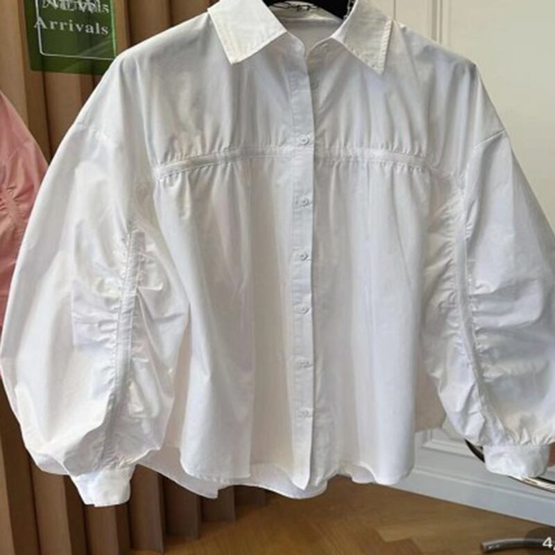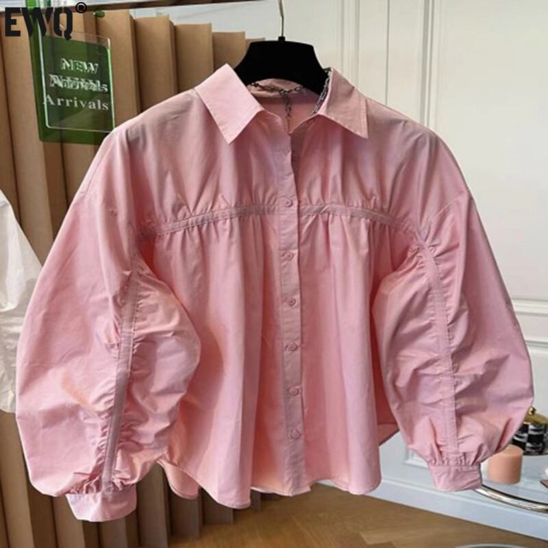 【EWQ】プリーツ ランタン 袖 巾着 レディース シャツ ゆったり 春 ラペル 無地 シンプル トップス ランタンスリーブ スプリング 春物 ソリッドカラー