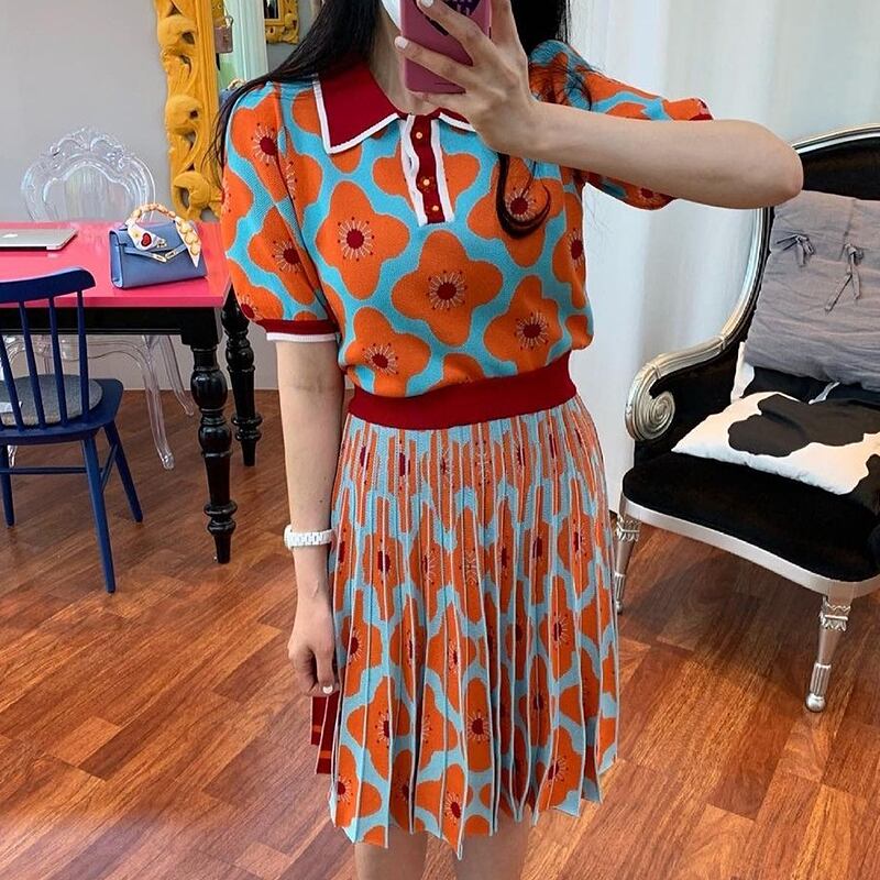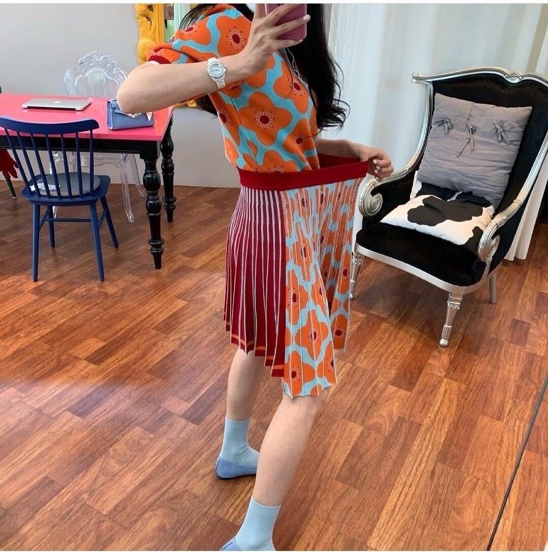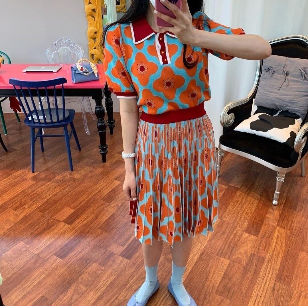 [EWQ] 夏レトロラペルルーズパフスリーブセーター + ウエストプリーツスカートコントラストカラースーツ 16F08400 サマー 夏物