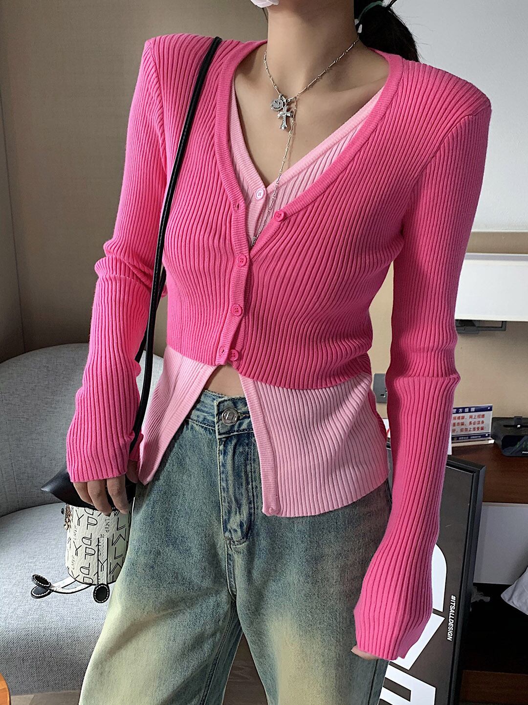 [EWQ] レディース Vネック フェイク ツーピース ニット パッチワーク カーディガン ジャケット 春 秋 パッチワーク ニット ジャケット コート スプリング 春物 オータム 秋物