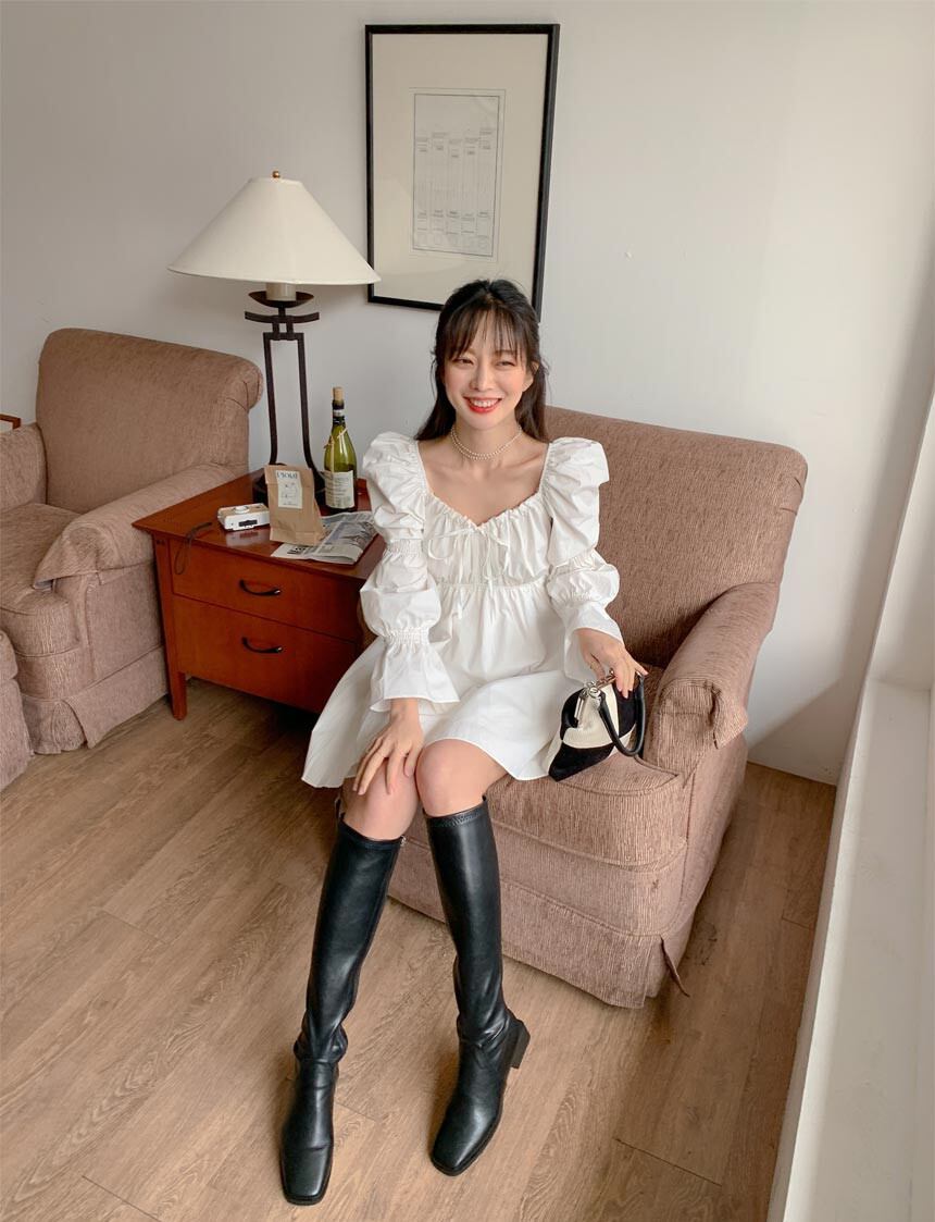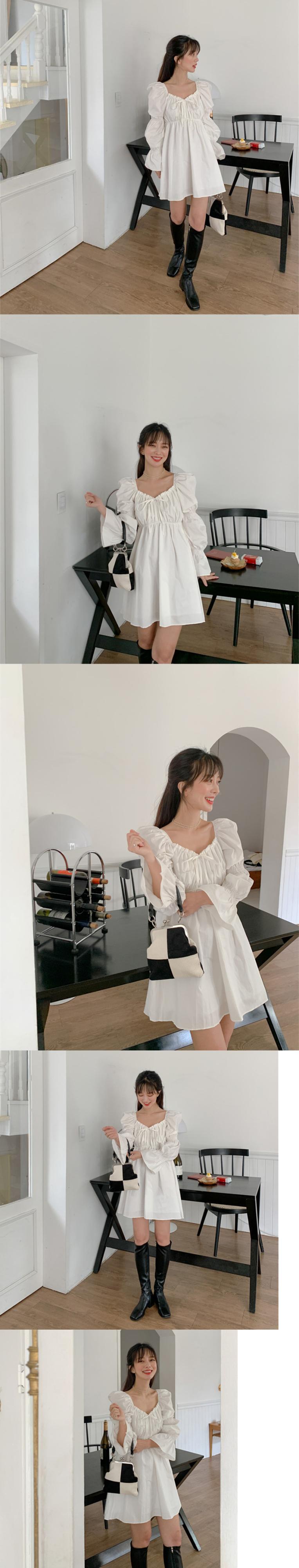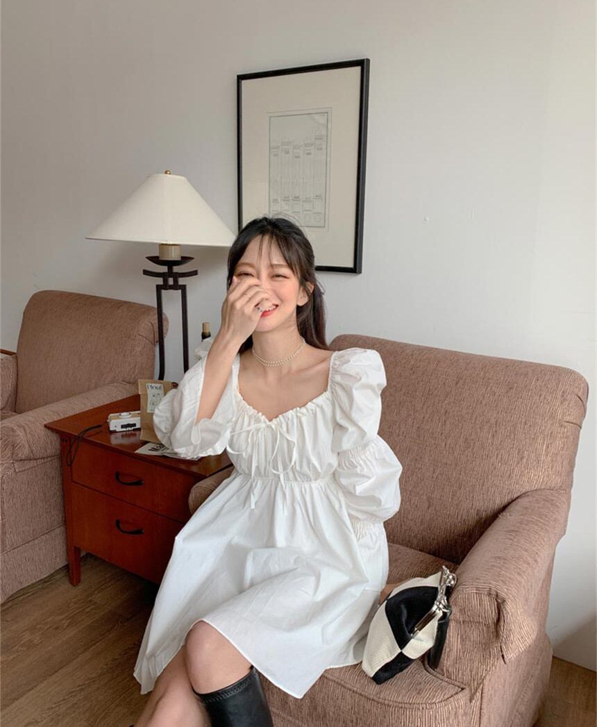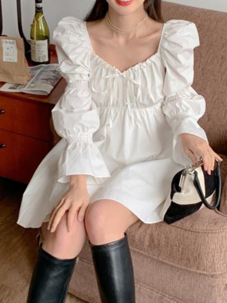 [EWQ] スクエアカラー プリーツ レースアップ ミニドレス レディース 長袖 無地 ドレス 春夏 Vestido 16Y6940 ロング スプリング 春物 サマー 夏物 ソリッドカラー スクウェア