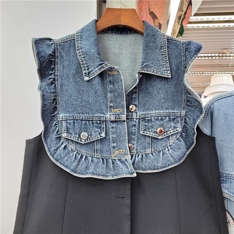 [EWQ] フェイク ツーピース スプライシング デニム ジャケット フリル パッチワーク ノースリーブ シングル ブレスト ジャケット コート夏潮 02 サマー 夏物