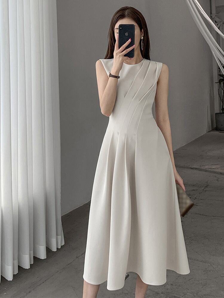 [EWQ] シックオフィス アプリコット ドレス Vestido モダン レディ ノースリーブ O ネック パーティー夏 16T2702 サマー 夏物 Oネック 会社 学校 通勤や通学にも