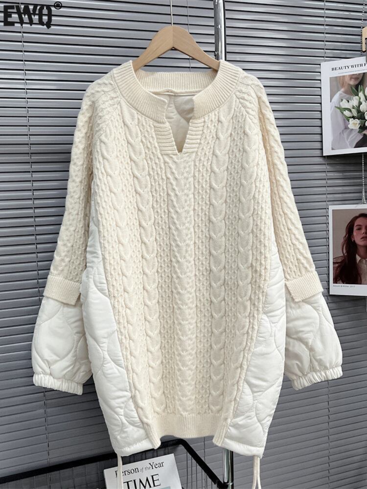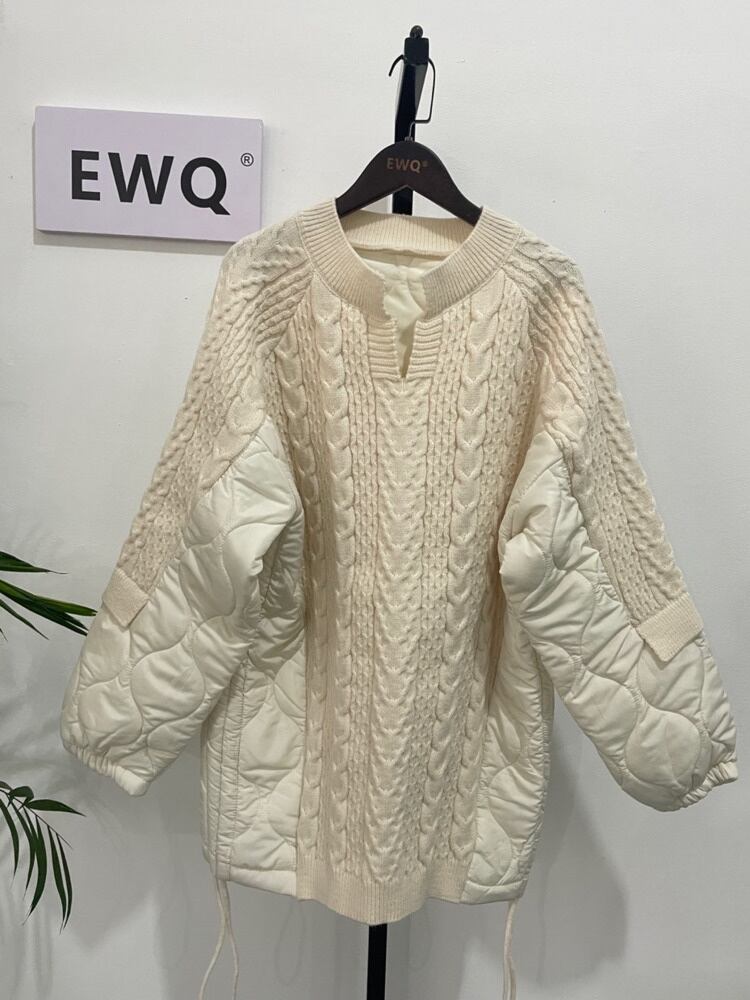 [EWQ] V ネック綿継ぎルース ブラウス長袖トップス ニット春冬プルオーバー セーター ロング コットン スプリング 春物 ウィンター 冬物 Vネック