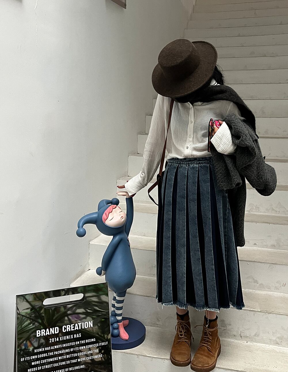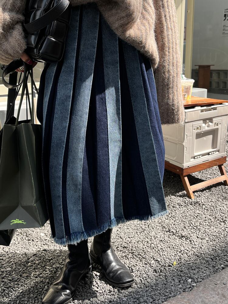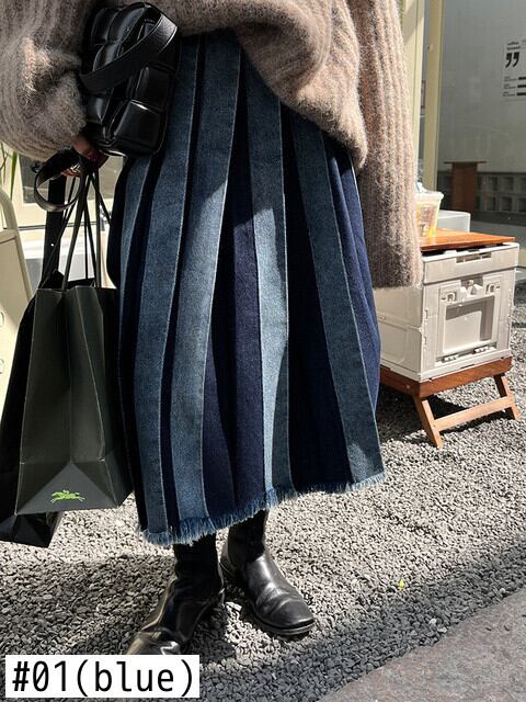 【EWQ】カラーコントラスト レディース デニムスカート スプリング ラルガスウエスト Aライン プリーツスカート 16Y5565 春物
