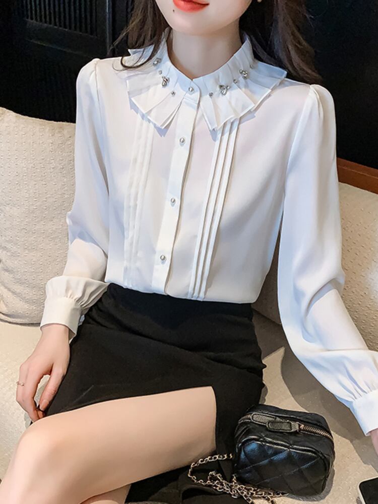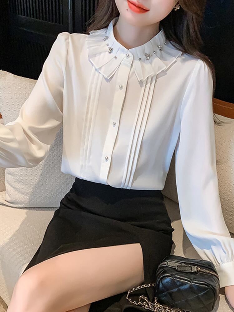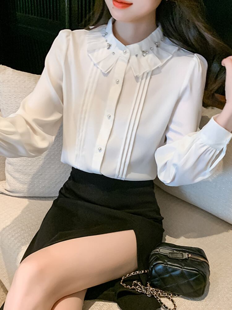 [EWQ] ミニマリストルースダイヤモンドスプライシングシャツ春秋トレンドシックスタンドカラーブラウストップス 16Y6051 スプリング 春物 オータム 秋物