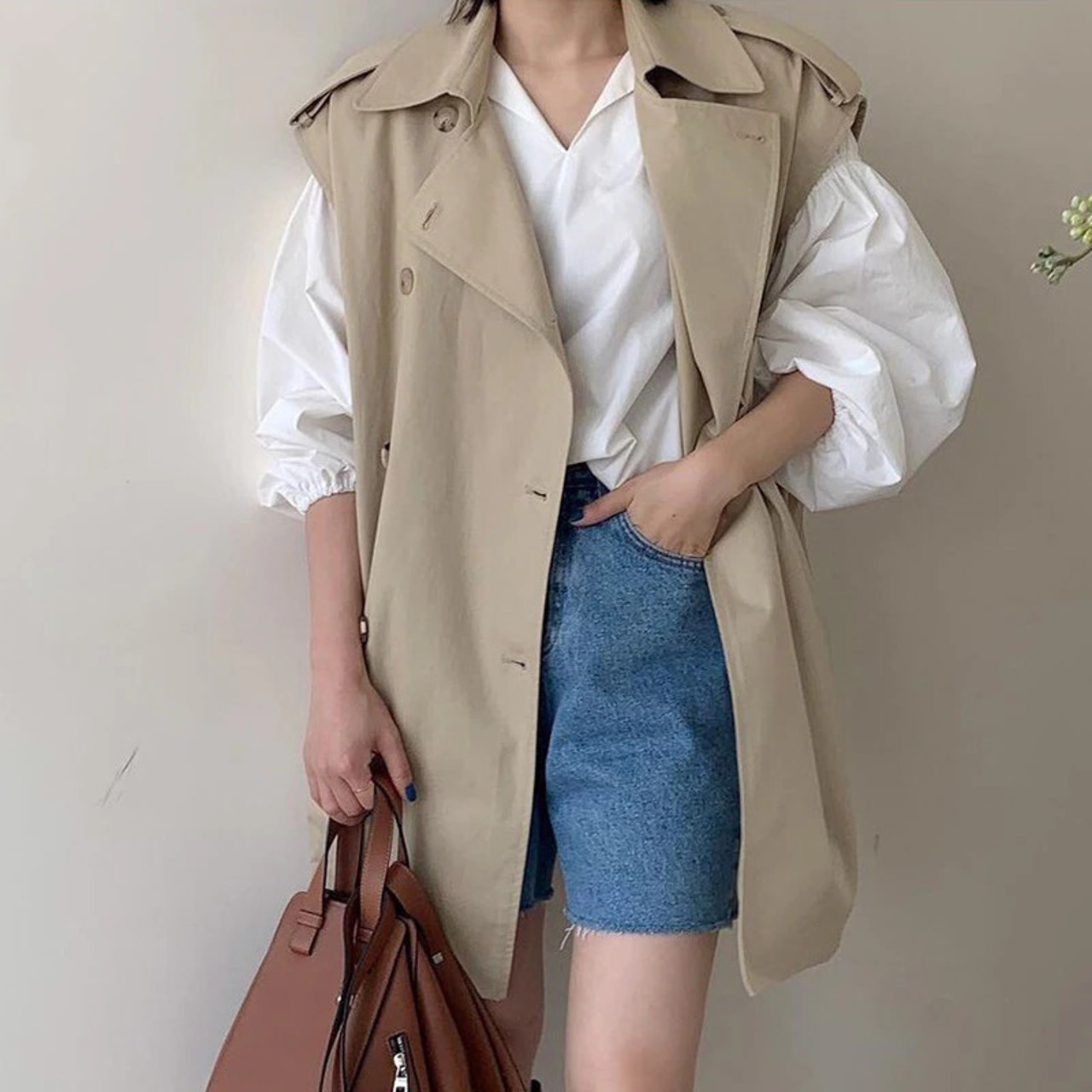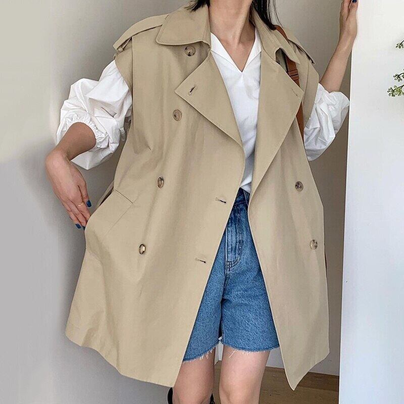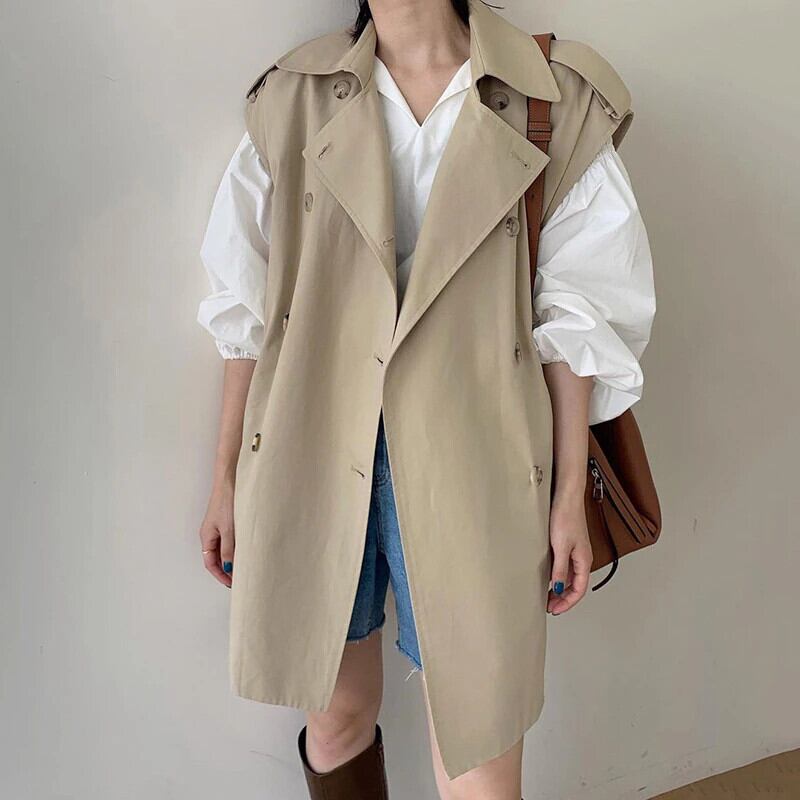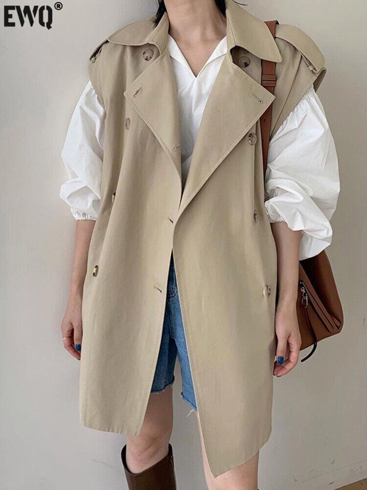 【EWQ】シンプルルーズコートラペルルーズノースリーブベストジャケットレディースアウターカーキオーバーコート春16Y11 スプリング 春物