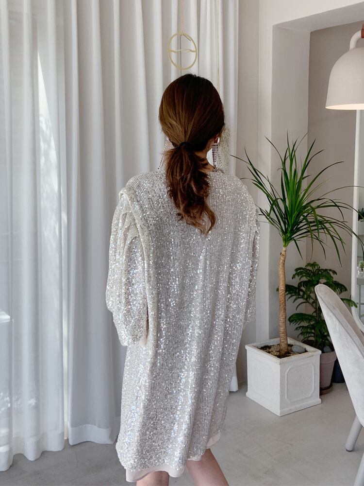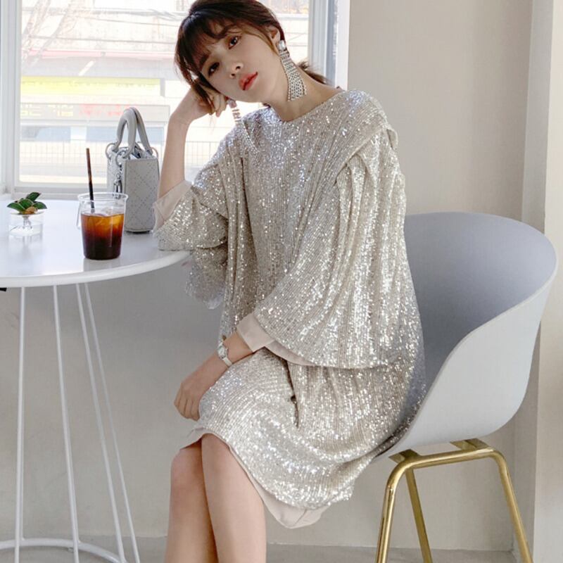 【EWQ】春夏 スウィート Oネック 五分袖 1 シルバー Tシャツ風 ワンピース風 スパンコールワンピース QX001 半袖 ハーフスリーブ 大人ガーリー キュート カジュアル スプリング 春物 サマー 夏物 銀
