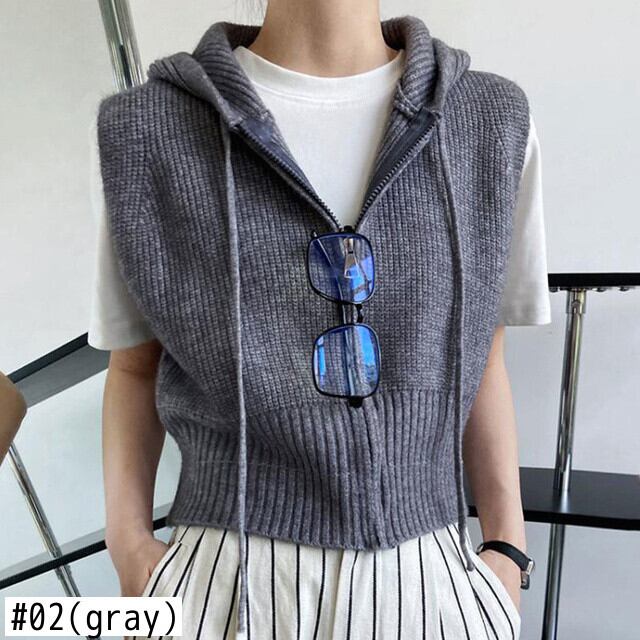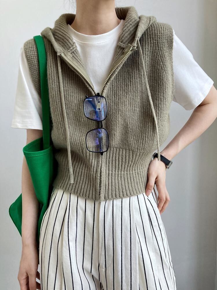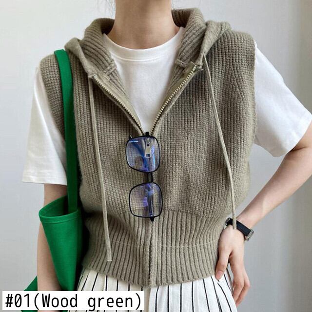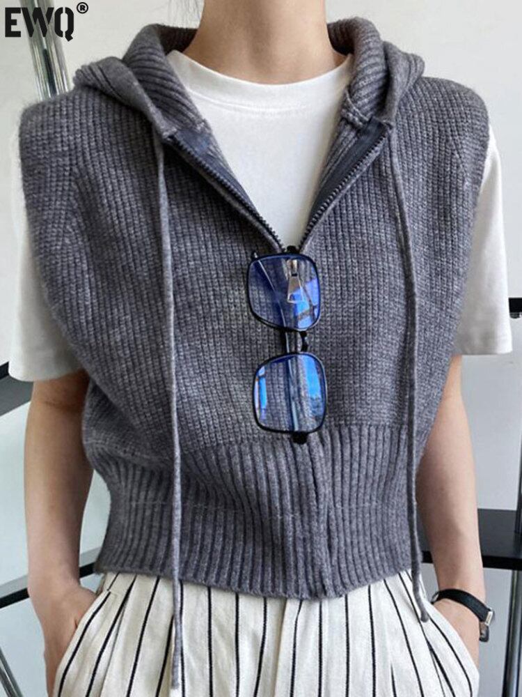 [EWQ] ノースリーブ レディース フード付き セーター ベスト 春 秋 シック 巾着 ジッパー ニット チョッキ 16Y5686 スプリング 春物 オータム 秋物