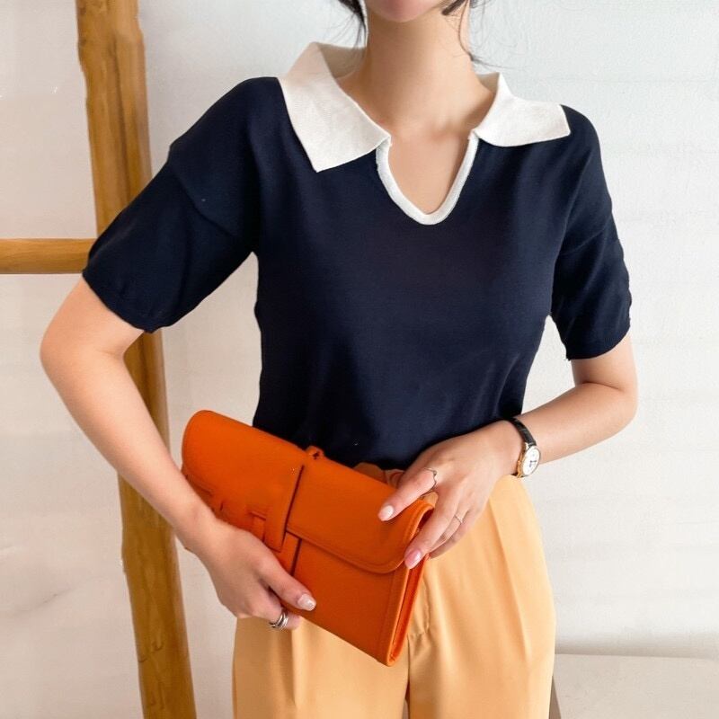[EWQ] レディース コントラストラペル セーター Tシャツ 半袖 パッチワーク ニット Tシャツ 春夏 トップス 7114 ショート ハーフスリーブ スプリング 春物 サマー 夏物