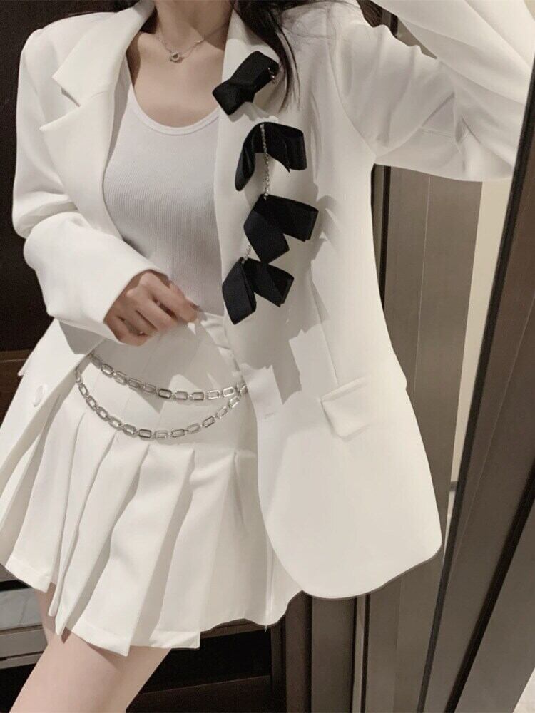 [EWQ] キアン コントラスト タイ ブレザー コート春秋長袖ブロッキング カラー スーツ ジャケット トップ 7336 ロング スプリング 春物 オータム 秋物