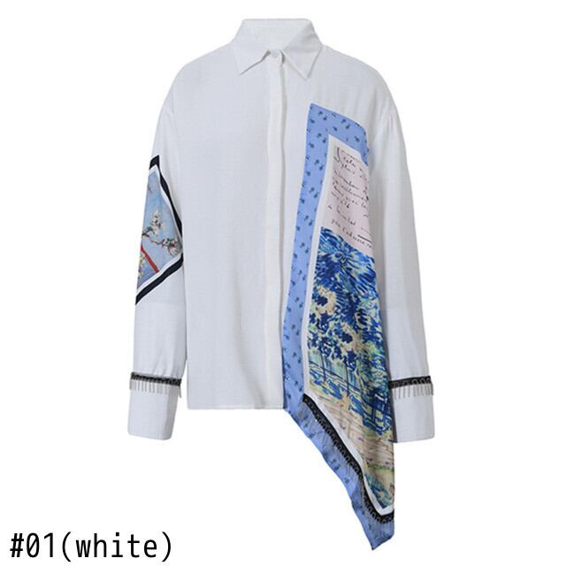 【EWQ】シックホワイトプリントビッグサイズイレギュラーブラウス長袖フィットシャツプリントトレンドレディース春秋 ロング スプリング 春物 オータム 秋物