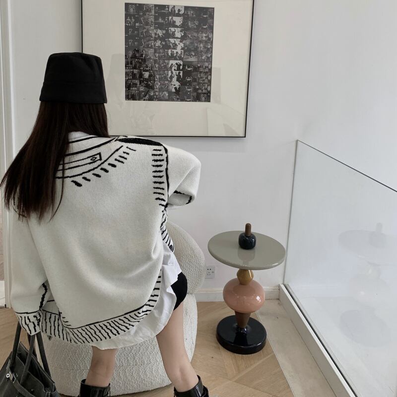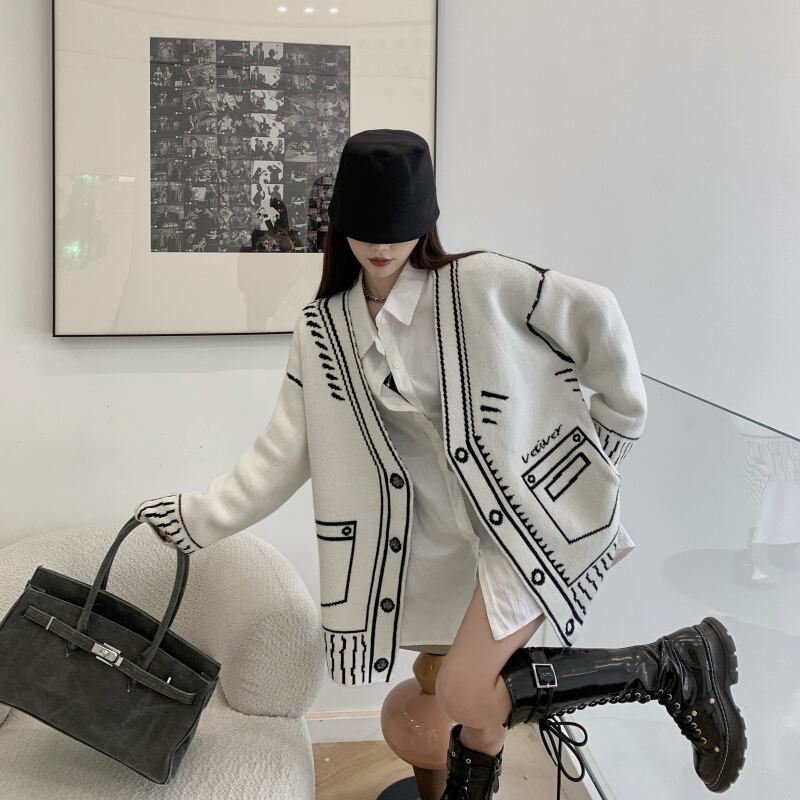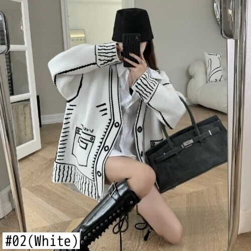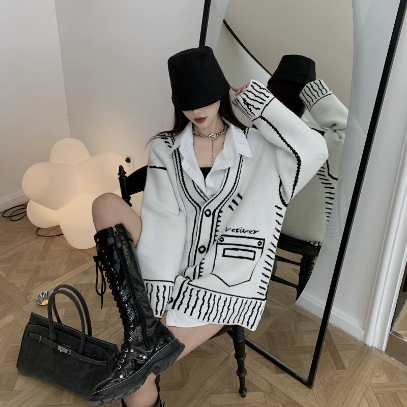 【EWQ】気質Vネックグラフィティカーディガンニットジャケットロング春ビッグサイズニットセータートップスコート スプリング 春物