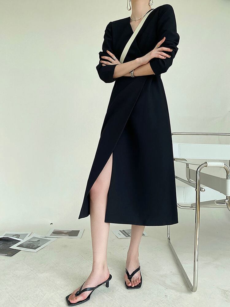 [EWQ] セクシー V ネック ブレザー ドレス ベルト ウエスト スプリット A ライン Vestido ドレス春秋 Rode 286 スプリング 春物 オータム 秋物 ハーネス Vネック Aライン
