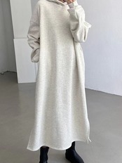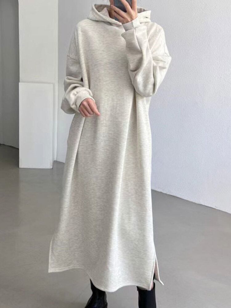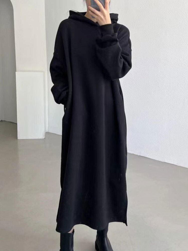 【EWQ】レディース フード付き 無地 ロングワンピース スプリットワンピース オフィスレディ 秋冬 16Y5247 オータム 秋物 ウィンター 冬物 ドレス ソリッドカラー 会社 学校 通勤や通学にも