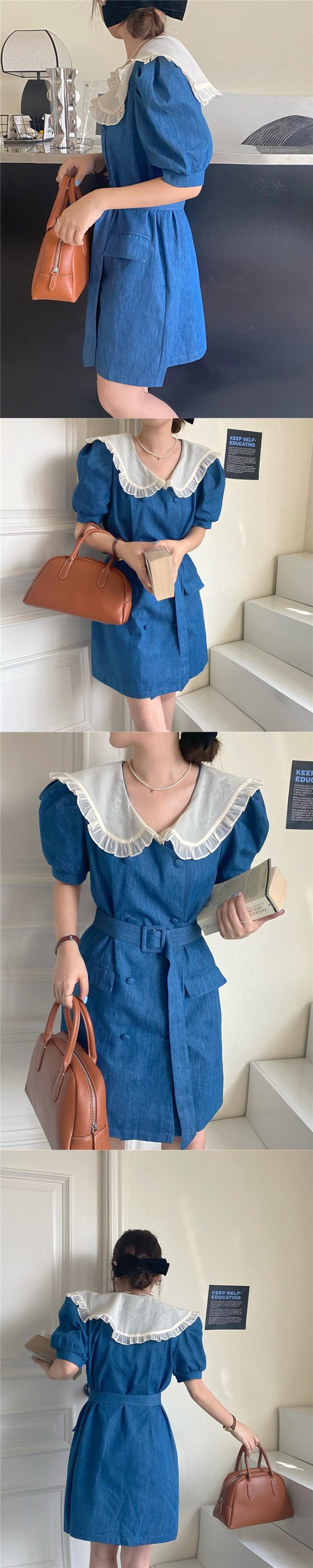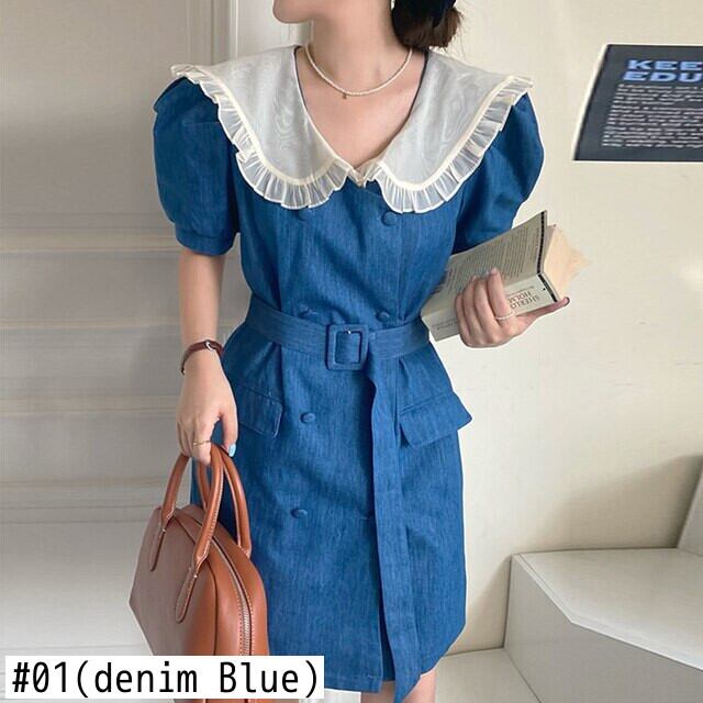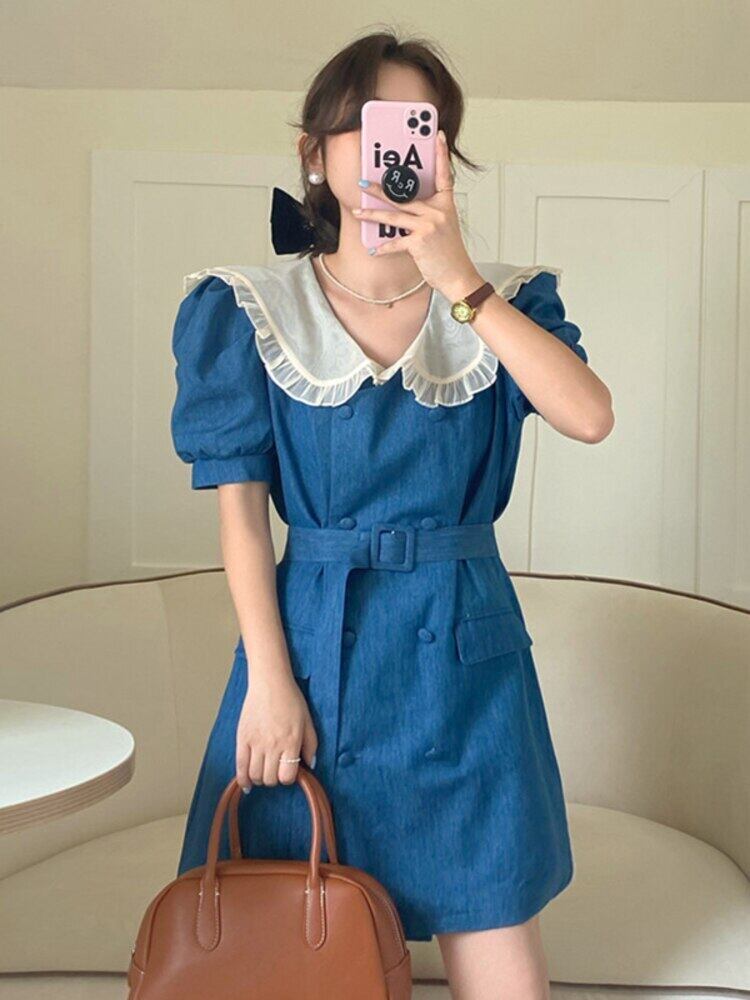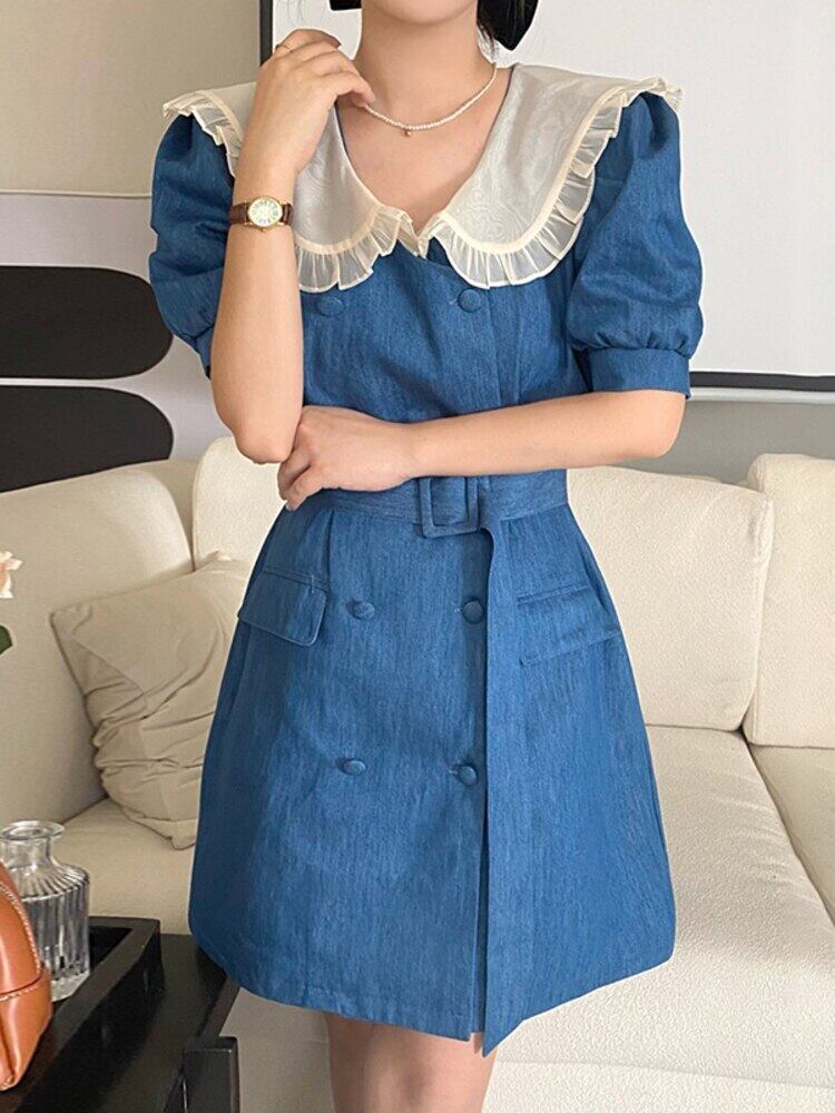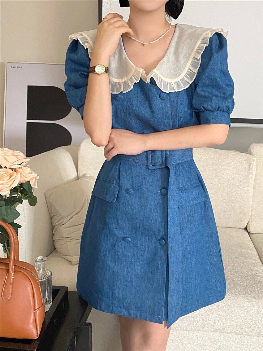 [EWQ] ピーターパンカラーコントラストミニドレスダブルブレストレースアップドレス夏パフスリーブ Vestido 7419 サマー 夏物